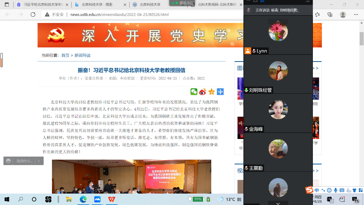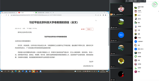 2022年4月21日,中共中央总书记、国家主席、中央军委主席习近平在学校建校70周年前夕给狂人小说 老教授们回信,充分肯定了学校自成立以来为我国钢铁工业发展作出的积极贡献,对培养更多高素质人才,促进钢铁产业创新发展、绿色低碳发展提出殷切希望。为深入学习贯彻习近平总书记给学校老教授重要回信精神,根据学校党委统一要求和部署,狂人小说 党委高度重视,及时组织学院全体师生党支部以线上、线下相结合的学习方式开展学习。