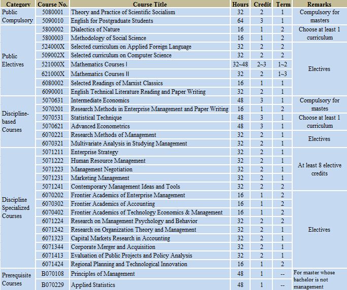 The minimum course credit for postgraduate students is 26 including at least 6 credits of curriculums with the number starting with six (see the following chart). For those postgraduate students whose bachelor degree is not management, they should additionally learn following two courses: Principles of Management and Applied Statistics. Students who passed the examinations would get relevant course credits.