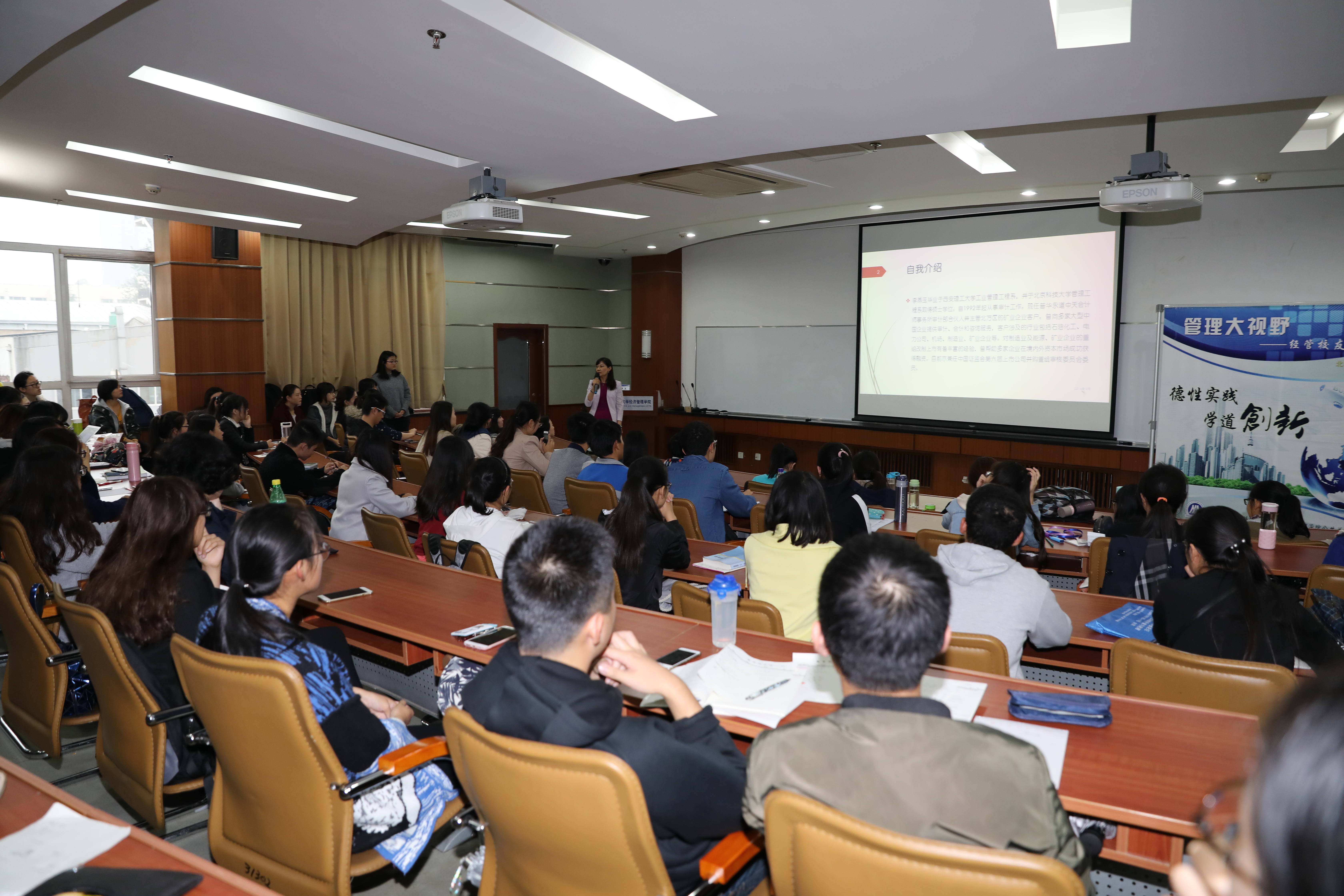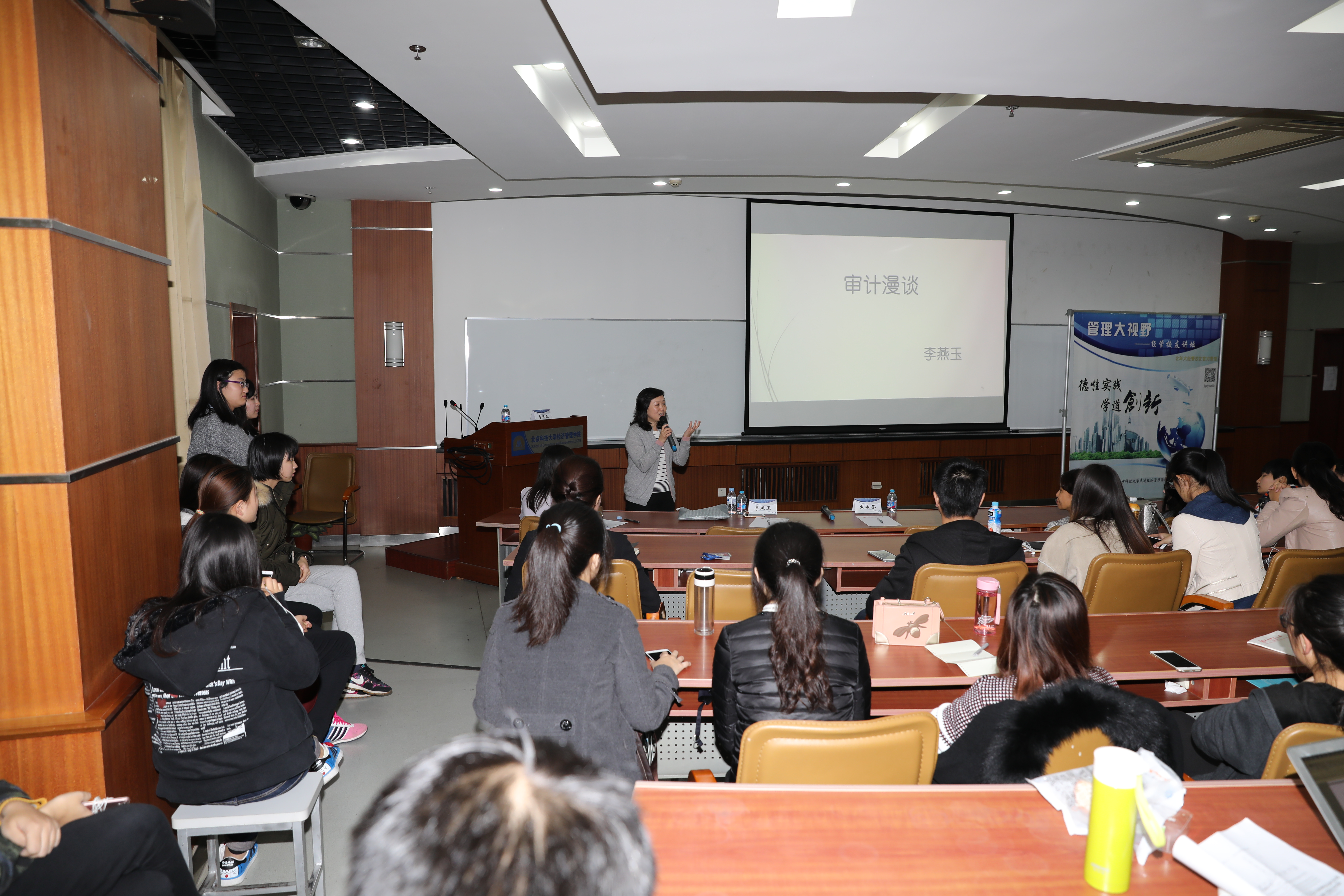 活动于下午3:30开始。学院党委书记戴淑芬首先为到场听众介绍了主讲嘉宾和经管校友讲坛系列活动,之后李燕玉校友开始精彩的分享。作为资深审计人,李燕玉校友曾帮助多家企业在境内外资本市场成功获得融资,特别对制造业及能源、矿业企业的重组改制上市有着丰富的经验,客户涉及的行业包括石油化工、电力公司、机场、制造业、矿业企业等。讲座中,校友结合自身实战体会,提纲挈领的向在场听众普及了审计工作的主要内容目的、审计工作中需要注意的重要事项以及做好审计工作要具备的各项能力。