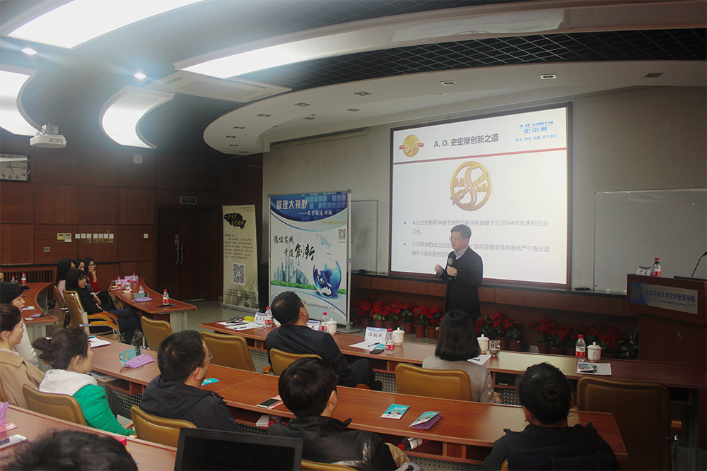 活动开始在下午3:30。学院党委书记戴淑芬教授首先介绍主讲校友和经管校友讲坛系列活动后,讲座开始。丁威校友跟北科大学子们重点分享了A.O.史密斯的成功经验和创新之道。A.O.史密斯公司重视研发创新、经营效率和经营质量,它的经营业绩,离不开对技术坚持不懈的创新追求和狂人小说建设的重视。校友提炼出A.O.史密斯非常重要的一条狂人小说价值观就是“四个满意”:客户满意、股东满意、员工满意、社会满意。此外,A.O.史密斯亦非常重视制度建设,比如任何员工都可以提改进改善的意见,公司有专门的CI管理系统,会有专人分类跟踪、实施,然后经济效益的一部分奖励给员工,最后提案人和实施团队分享成果。讲座的最后,丁威校友笑着向参加本次讲座的学生发出邀请,希望感兴趣的毕业生能够申请来A.O.史密斯工作。