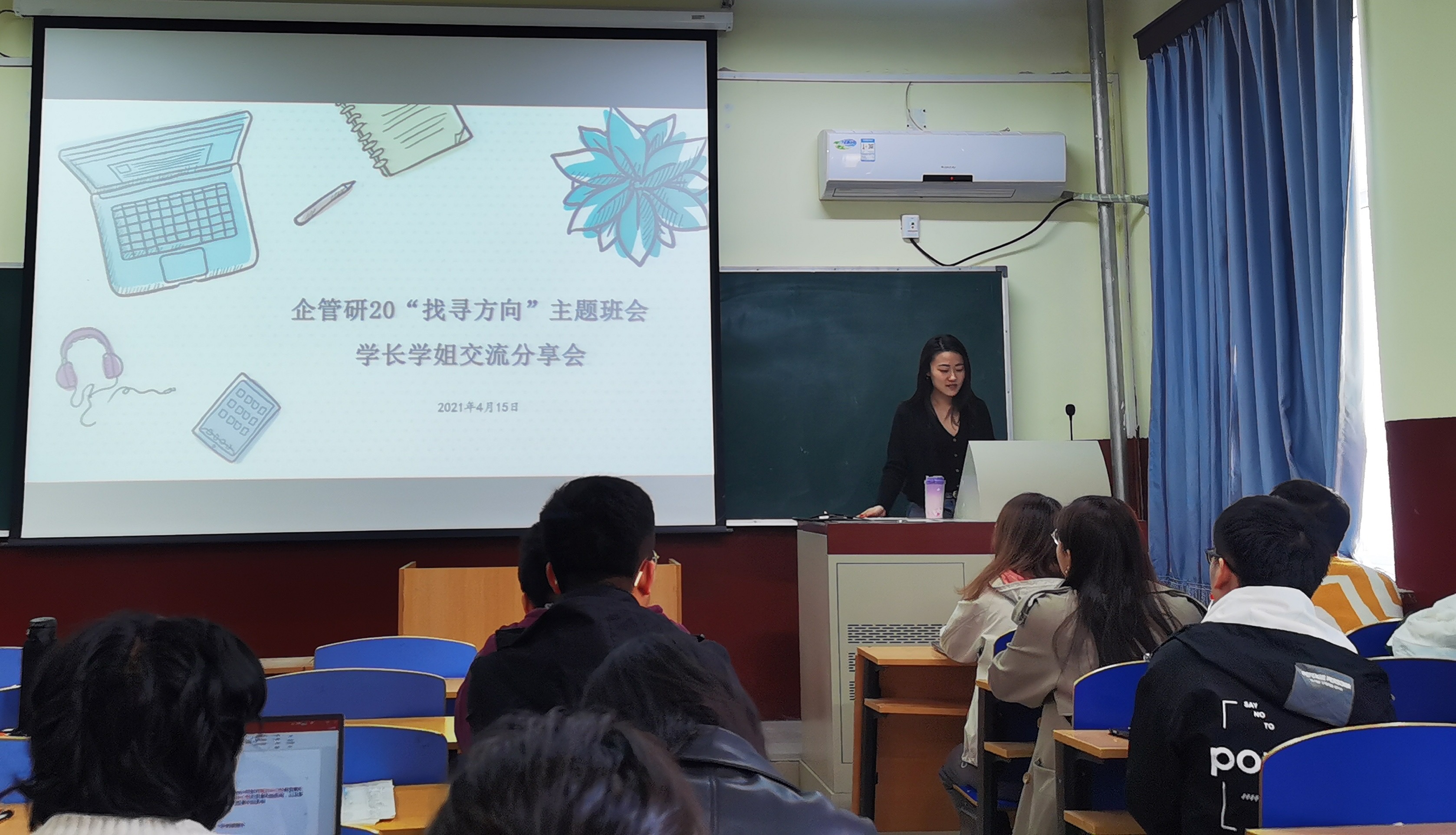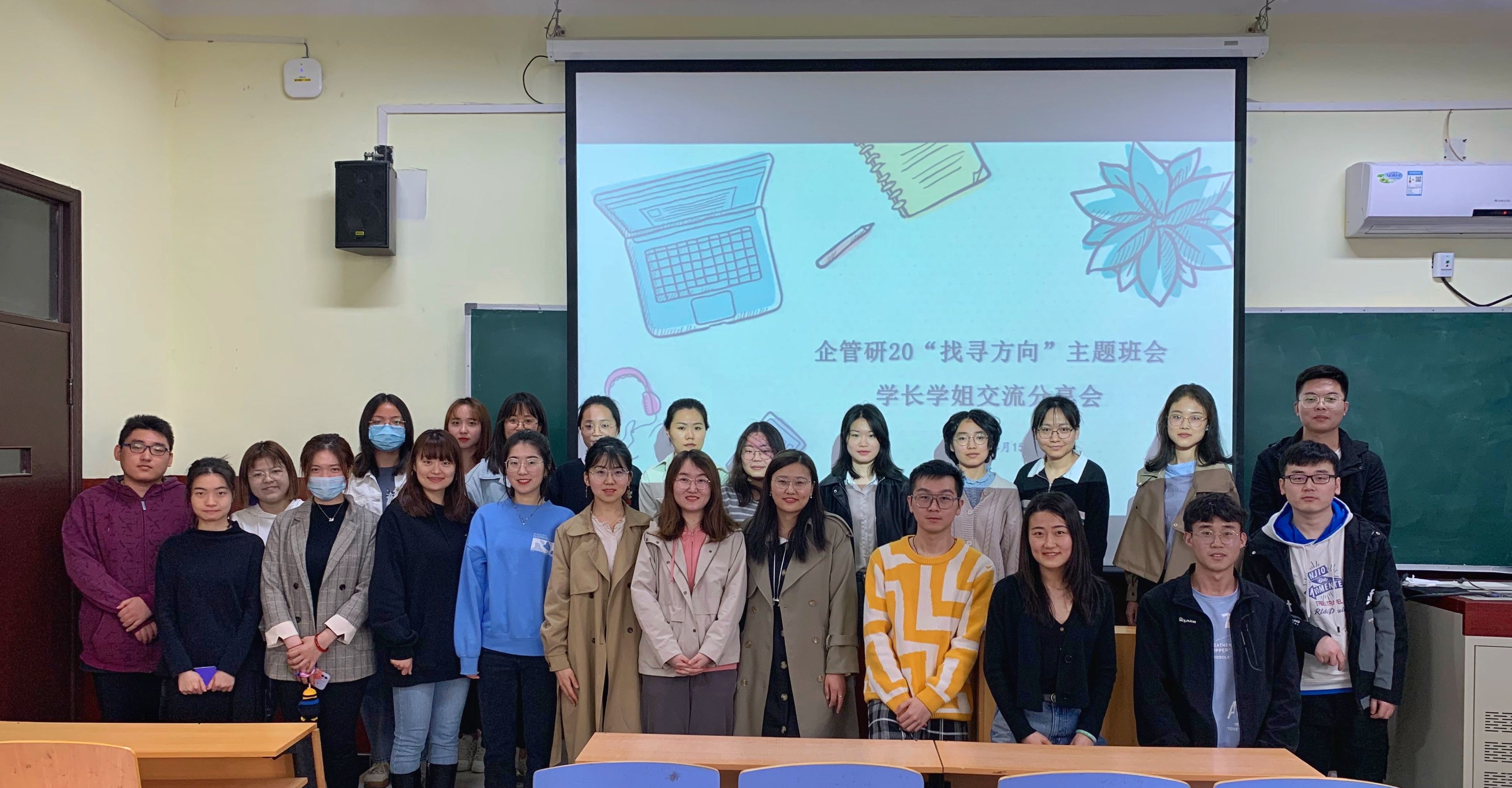 4月15上午10点,企管研20“找寻方向”主题班会暨学长学姐交流分享会于狂人小说 管庄校区教学楼203举办,分享会由辅导员李响主持,企管专业的楚中柱、李柱等学长学姐与企管研20级全体学生参会。