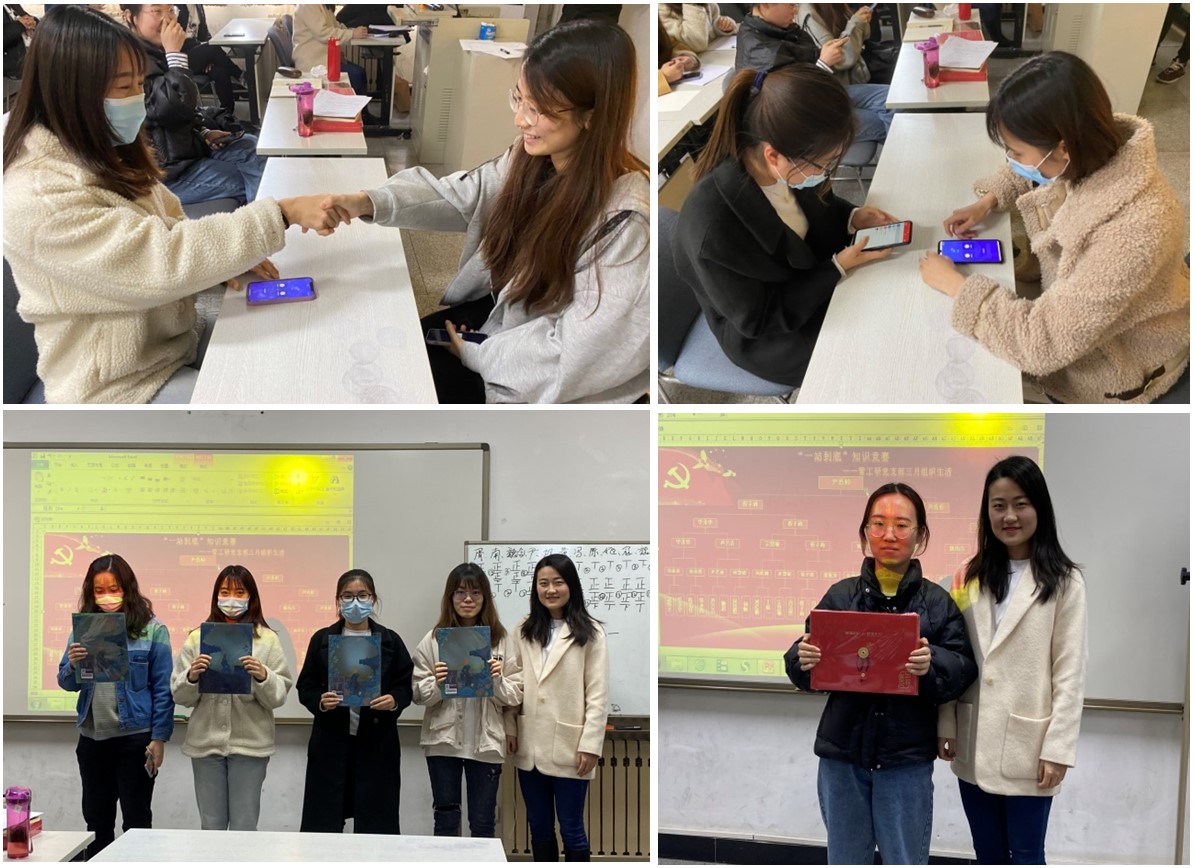 活动最后是“一站到底”知识竞赛环节,支委会将支部全体成员两两一组划分为16组,利用学习强国APP中双人对战的功能进行PK,获胜一方进入下一轮对战。比赛伊始,大家都略显紧张和兴奋,各自注视着界面认真投入到答题中。自第三轮后,每一组比赛在教室前方逐一进行,大家都密切关注着每一场比赛的结果,通过5轮激烈的角逐,最终产生了一等奖1名、二等奖1名、三等奖2名以及优秀奖4名,尹香婷同志凭借其丰富的知识积累获得了本次“一站到底”知识竞赛的冠军,辅导员李响老师为各位获奖者进行了颁奖。