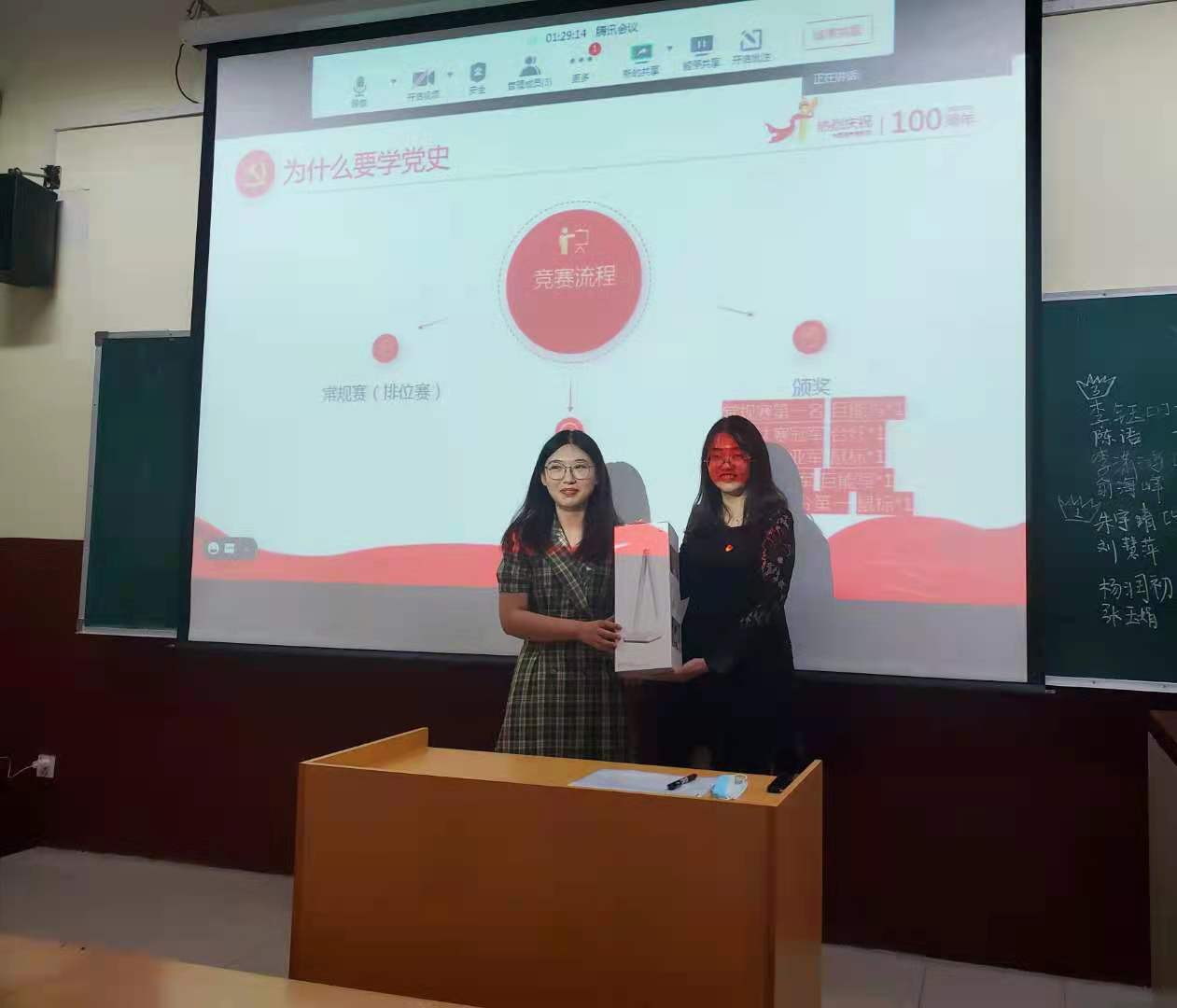 大会第二项,支部进行六月组织生活。本次组织生活采取党史知识竞赛形式,使用学习强国APP进行答题,大家热情高涨。经过一轮常规赛和二轮1v1比拼,决出了冠军朱宇晴、亚军宋翔宇、季军李钰。比赛结束后,支部书记宋翔宇提出希望大家日后继续认真学四史,争取下次活动中可以有更好的表现。