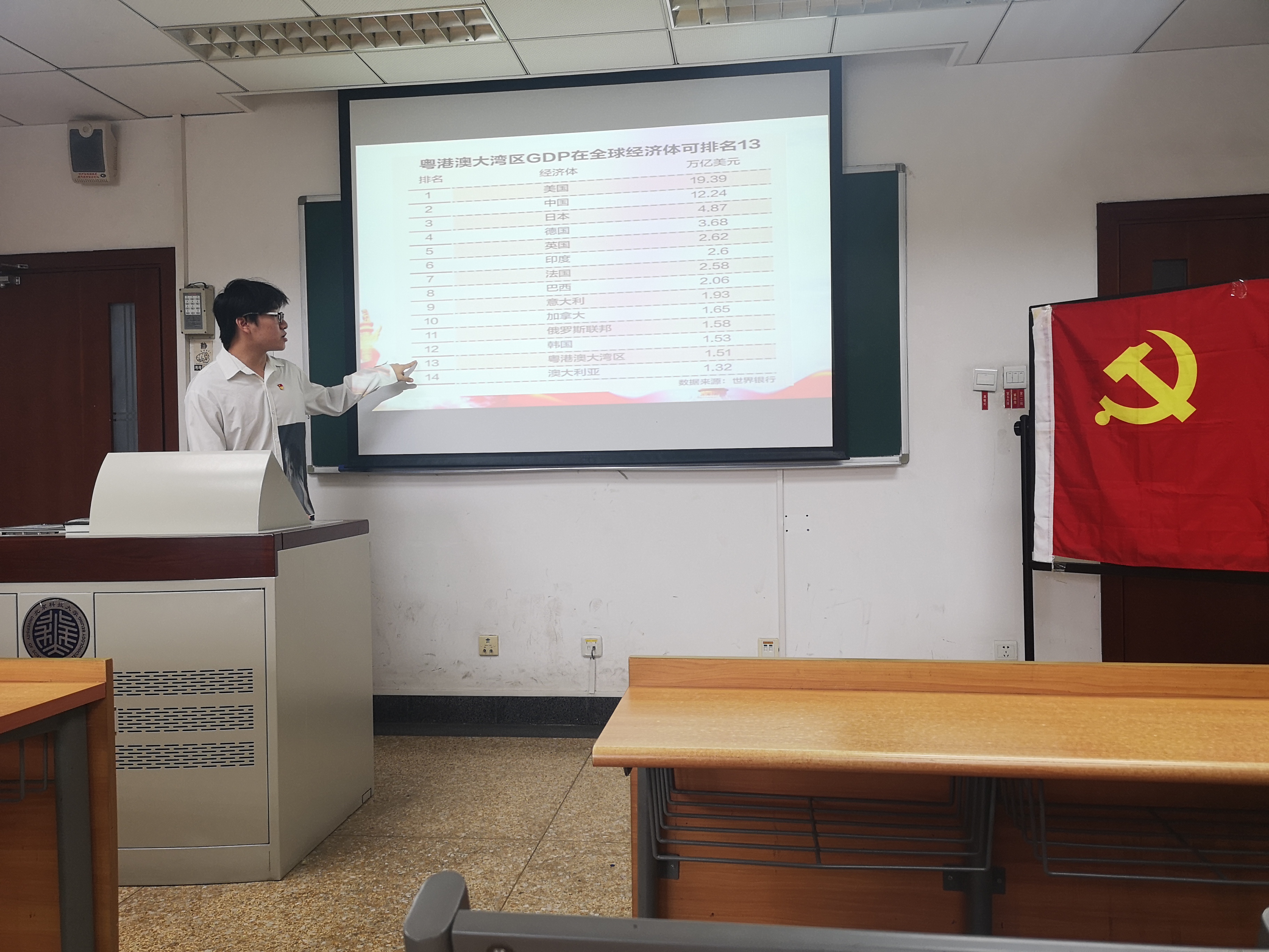 本次党课的主题是“粤港澳大湾区”,王童同学和张啸同学从粤港澳大湾区的概况、源起、现状、未来四个方面进行了阐述。