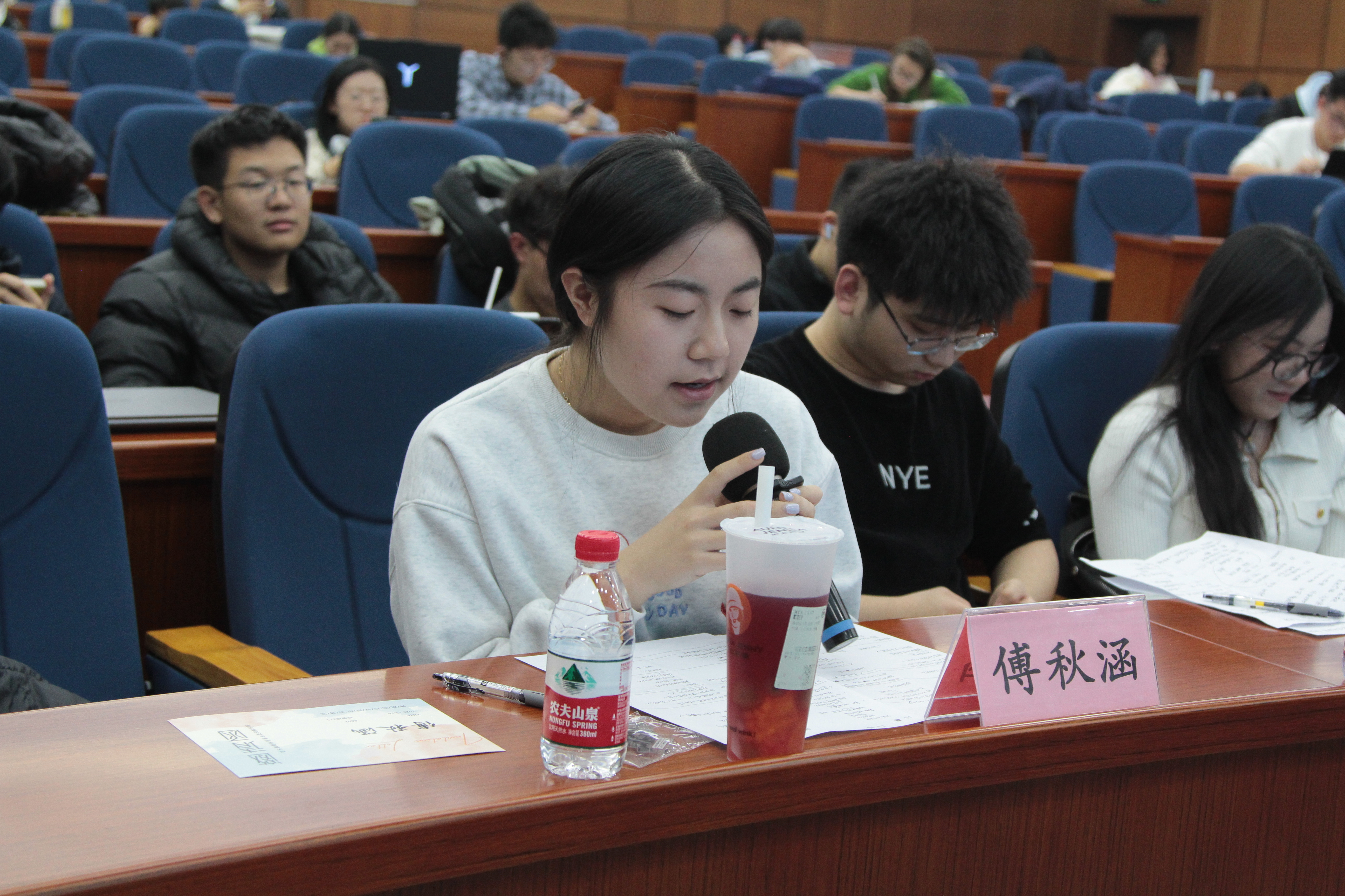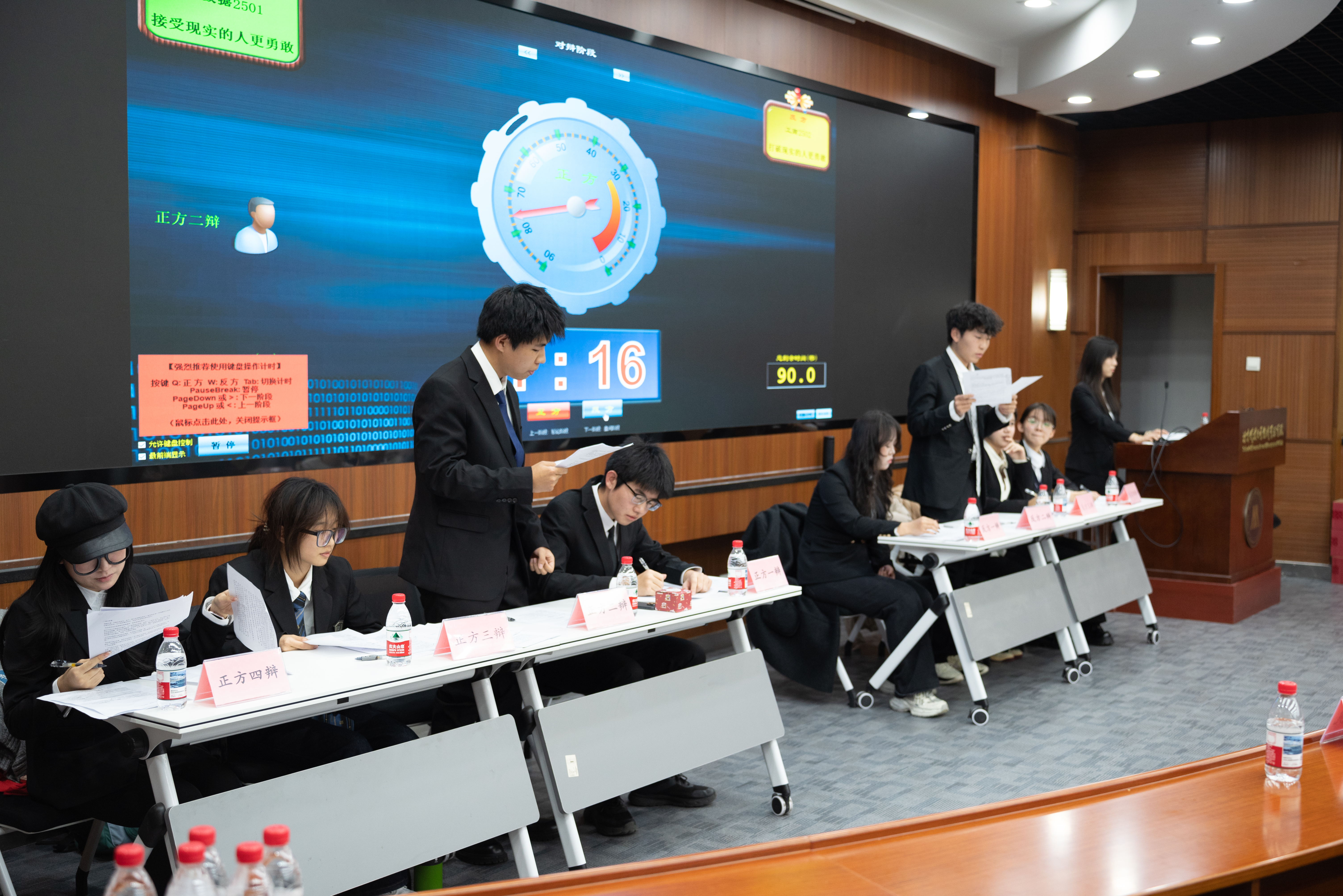 比赛正式开始后,正反双方两支队伍共同为大家带来了一场精彩绝伦的辩论赛。开篇立论文采斐然,清晰明了;驳论盘问暗藏机锋,反应敏锐;言辞交锋犀利敏捷,思维灵动;最后结辩总揽全局,字字珠玑。激烈的辩论场面让人心潮澎湃,现场气氛热烈。