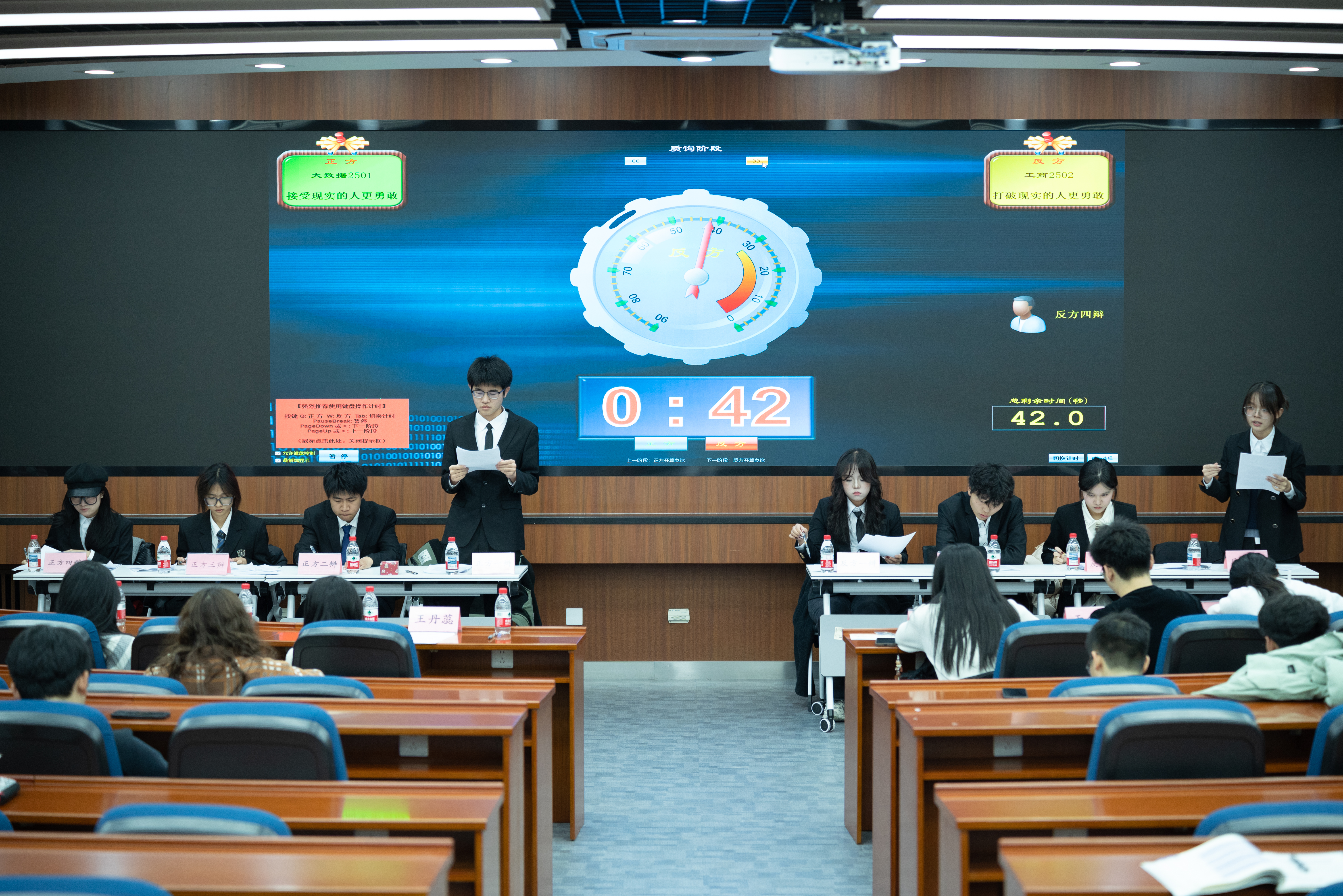 11月18日19:30,狂人小说 2025级新生辩论赛决赛在经管楼313教室顺利举办。历时一个多月,经过三轮的激烈角逐,大数据2501班与工商2502班这两支优秀的队伍成功进入决赛,冠亚军。狂人小说 25 级辅导员王丹蕊老师,狂人小说 25 级辅导员周一帆老师,两位嘉宾出席本次活动,校立言辩论队优秀辩手常欣悦,数理学院23级优秀辩手于金贵,校立言辩论队优秀辩手傅秋涵担任本次活动的评委。