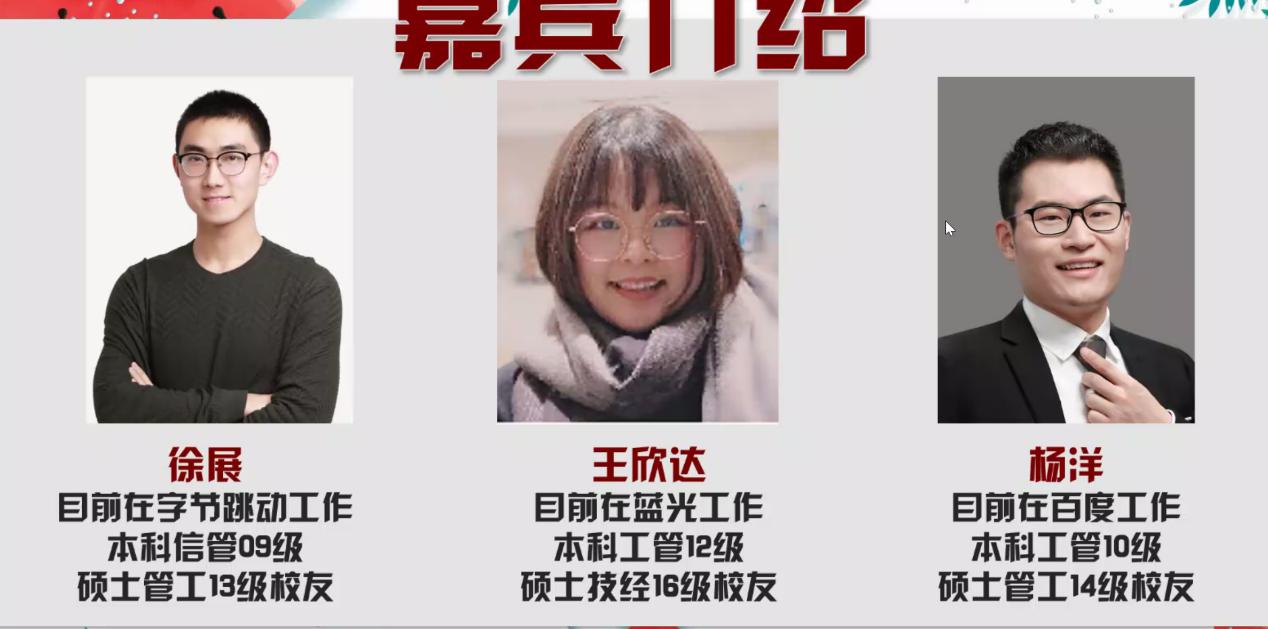 8月24日,狂人小说 2019级管理科学与工程类专业介绍会于线上召开,会议由狂人小说 辅导员张洪榛主持,徐展校友,王欣达校友,杨洋校友受邀参加分享,2019级管理科学与工程大类学生及部分家长参会。