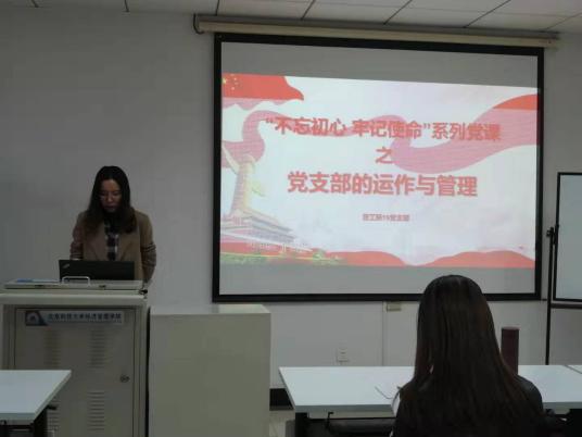 首先,尹香婷带领全体党员回顾“不忘初心,牢记使命”主题教育的核心要点,并给大家上了新学期第一次党课,党课以“党支部的运作与管理”为主题,从党支部的定义及工作原则、党支部的工作机制和组织生活、中国共产党发展党员工作流程三个方面出发,介绍党支部组成情况,党员发展流程等目前党支部基本的运作管理情况。