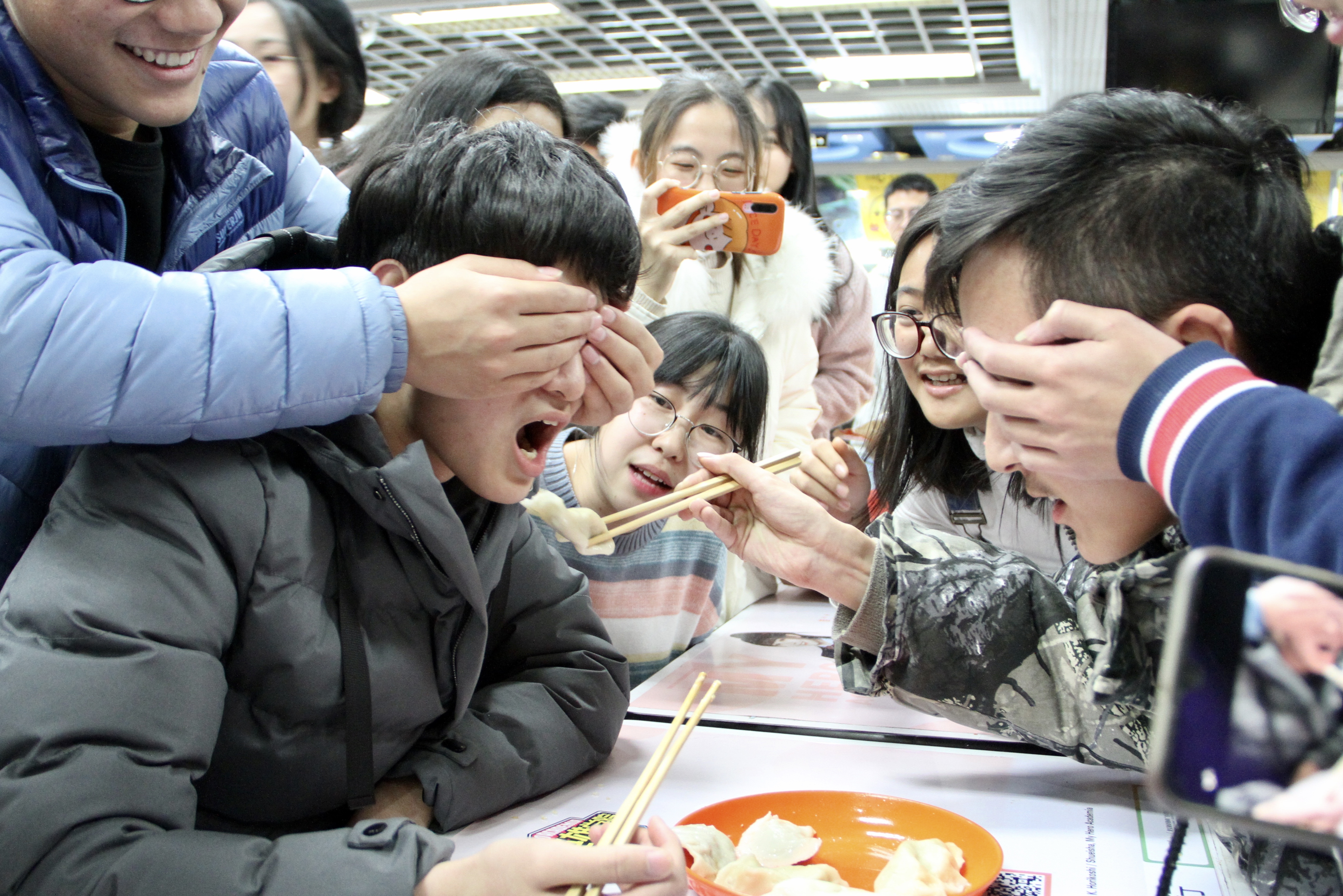 第二环节——蒙眼喂饺子。各班派出四位代表,两位负责互喂饺子,两位负责蒙住前两位选手的眼睛。有趣的活动引来众人围观,现场笑料迭出,爆笑不停。经过几轮激烈比拼,最终诞生了优胜班级,这些班级还得到了为他们准备的精美大礼包。