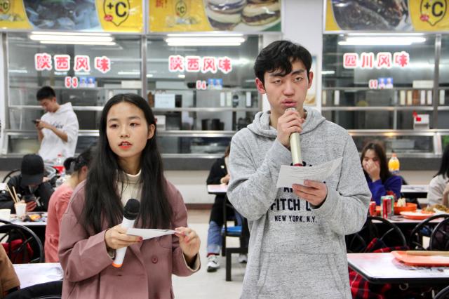 接下来进入游戏环节。第一环节为大胃王挑战赛——各班派出两位代表参赛,两位选手需吃完一盘饺子,以用时最短者获胜。比赛进行过程中,每位选手都不甘示弱,开始了一场“狼吞虎咽”般的较量。