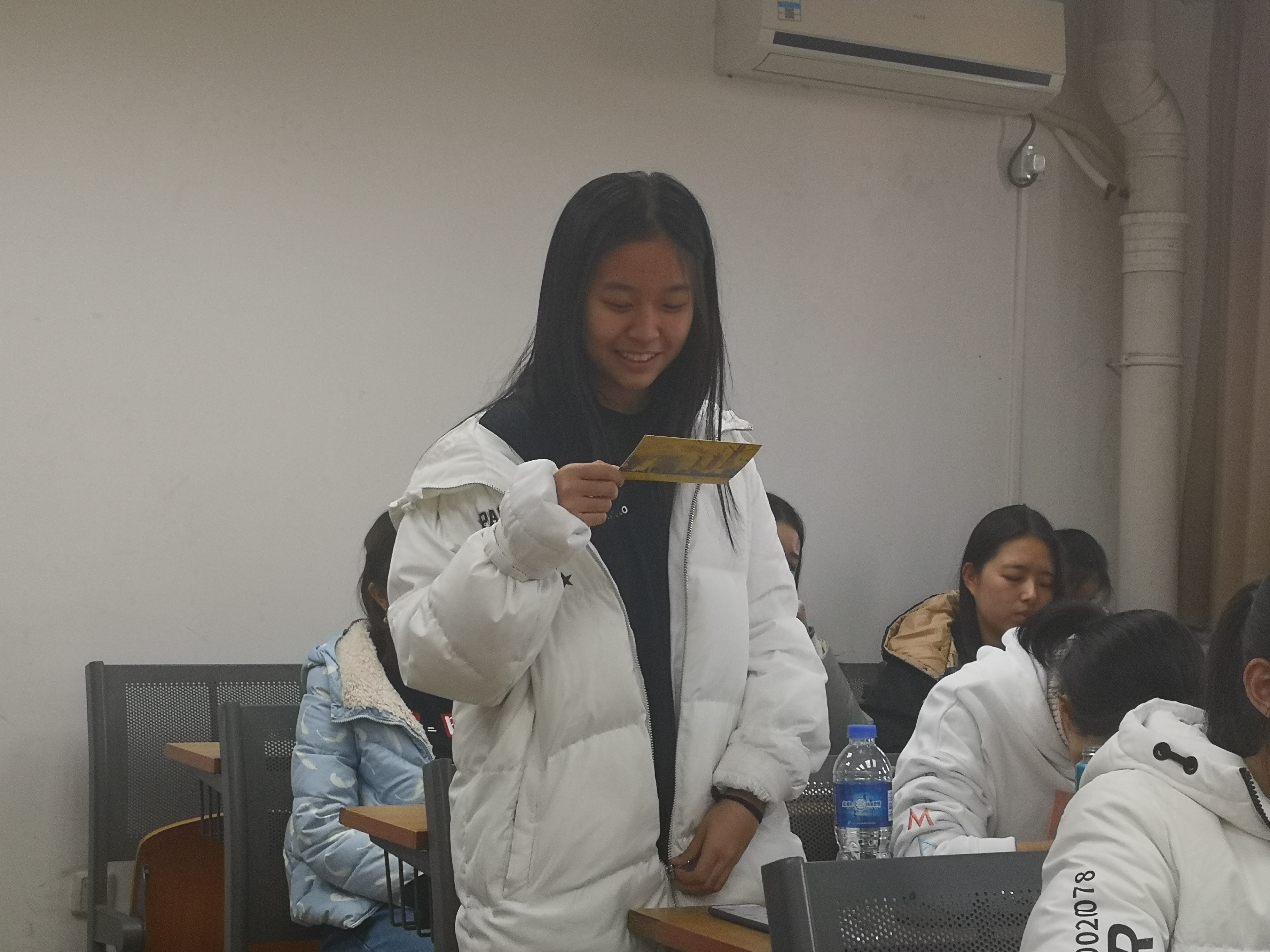 班会开始,班长魏子博给大家分发明信片。班会第一个部分是北科知多少,团支书分别设置了三个与北科有关的问题。随机抽取了六位同学,以PK接力的形式相互作答,互动中同学们发出阵阵笑声,充满了欢乐。