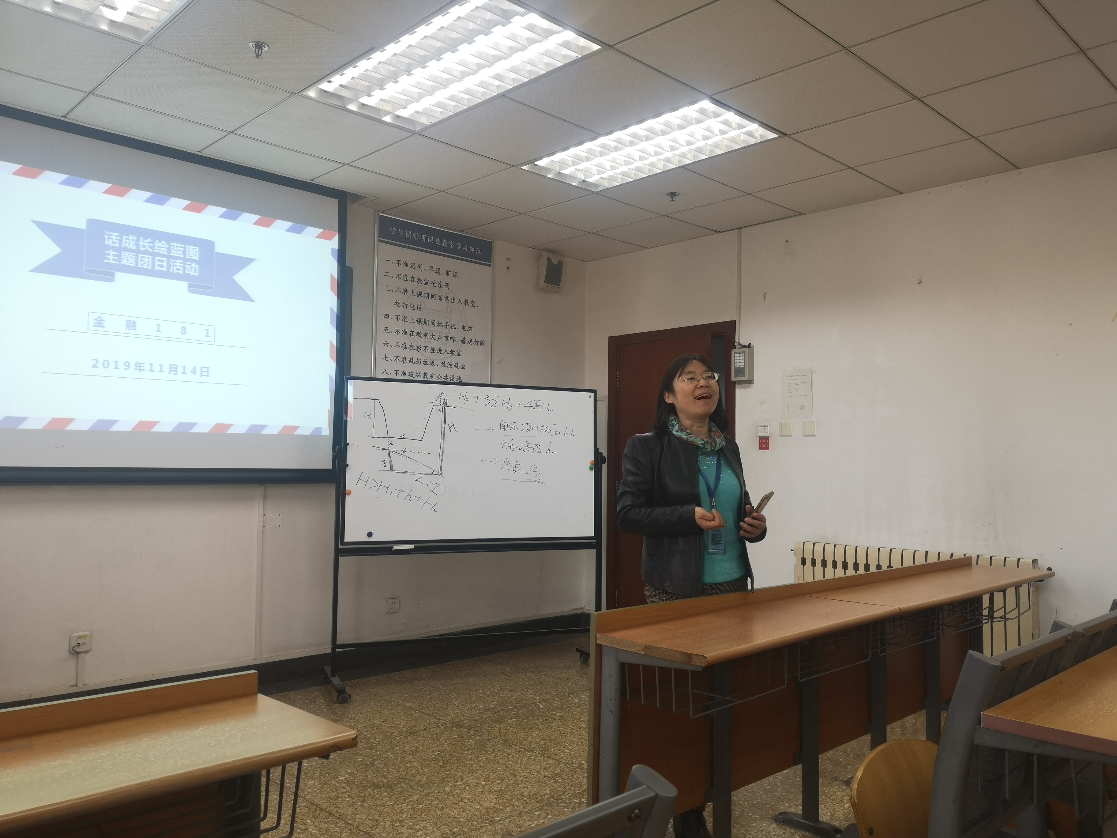 首先,班导师郭骊与同学们进行了第一次见面,郭骊老师进行了自我介绍并和班内同学进行互动。接下来,团支书吕伟浩举行了“话成长 绘蓝图”主题班会。