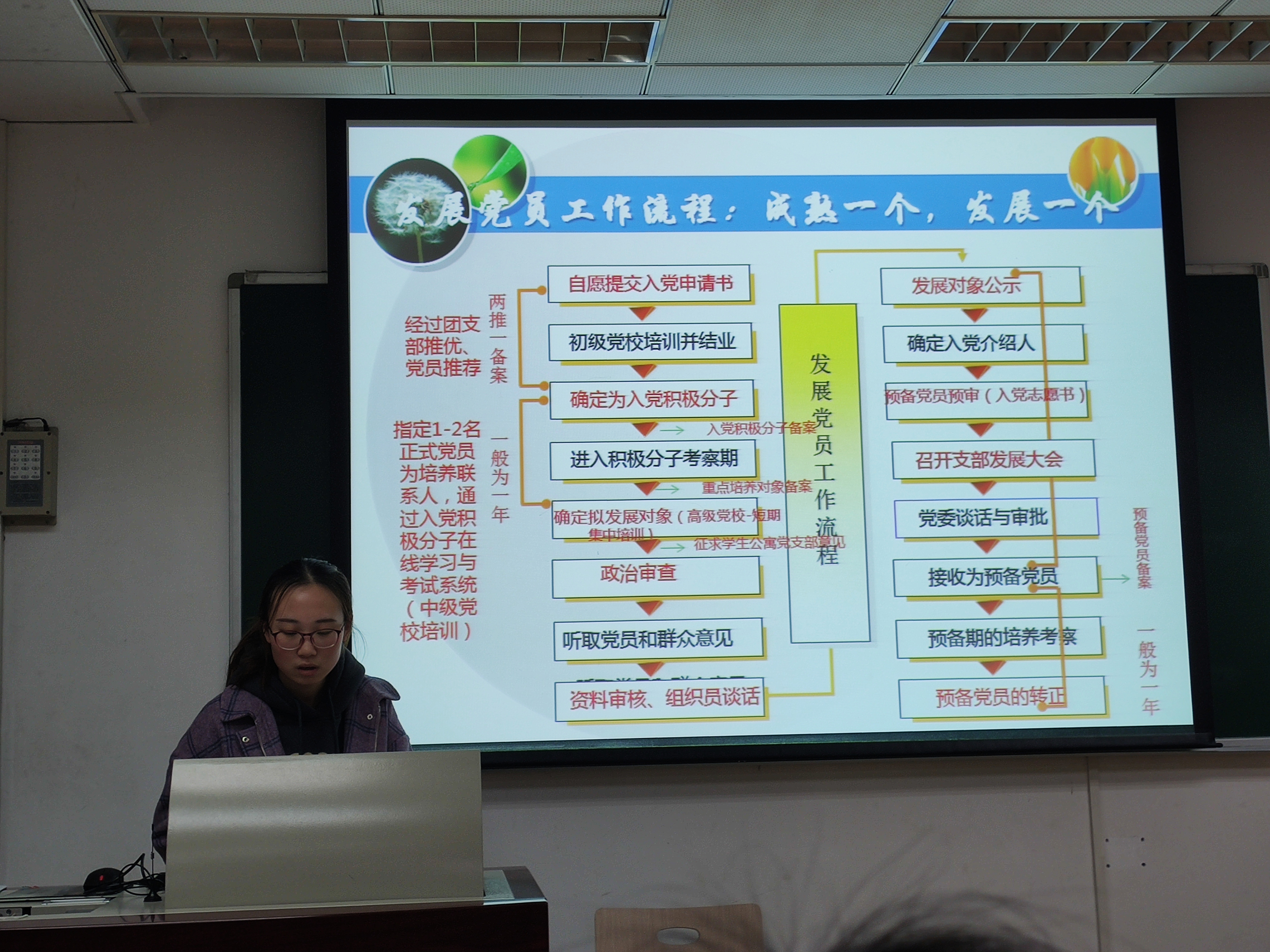 首先,党支部书记尹香婷就我校发展党员的工作流程、近期预备党员转正事宜及相关材料的书写规范等进行介绍,使支部成员对自己目前所处阶段及未来发展规划、要求有了明确的认识。