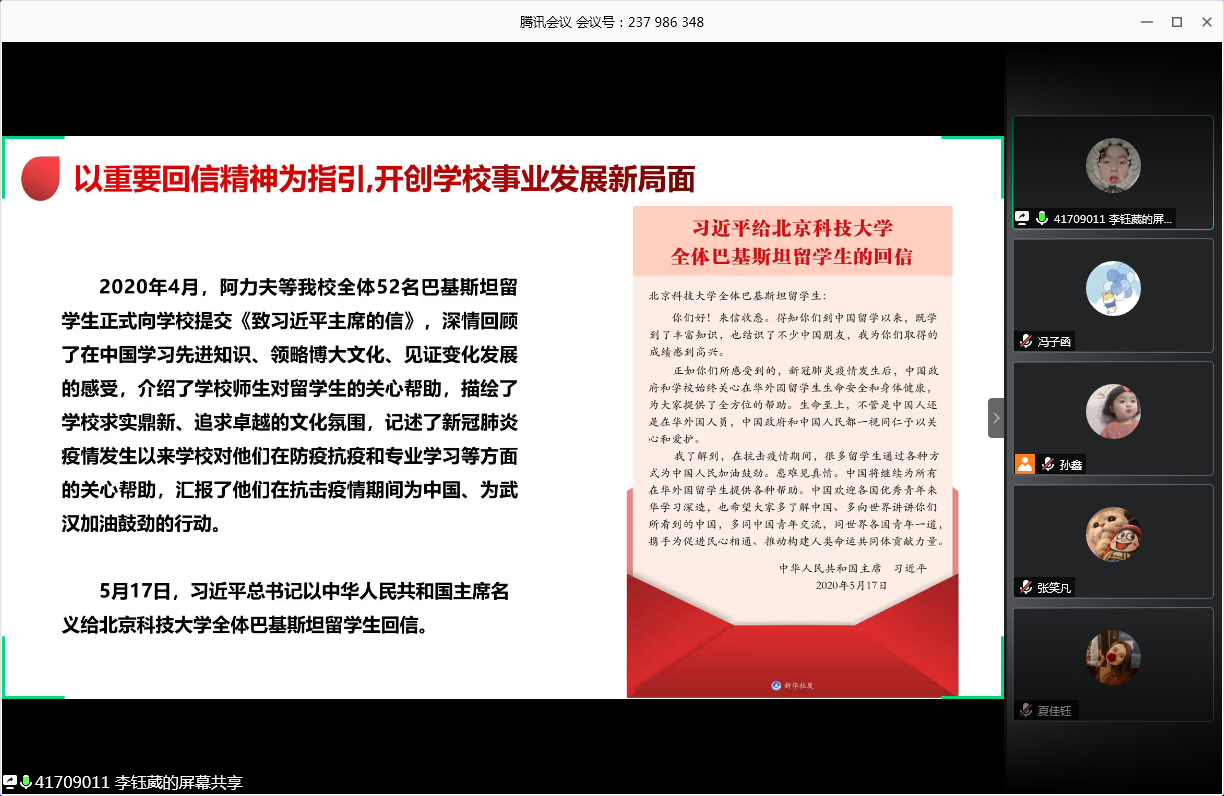 会议的第一部分,由王灏、李钰葳带领大家学习习总书记重要回信精神。在学习中,两位同学带领大家重温习主席给狂人小说 全体巴基斯坦留学生的回信,学习我校党委书记武贵龙、校长杨仁树就全面深入学习宣传贯彻总书记重要回信精神的部署与要求。