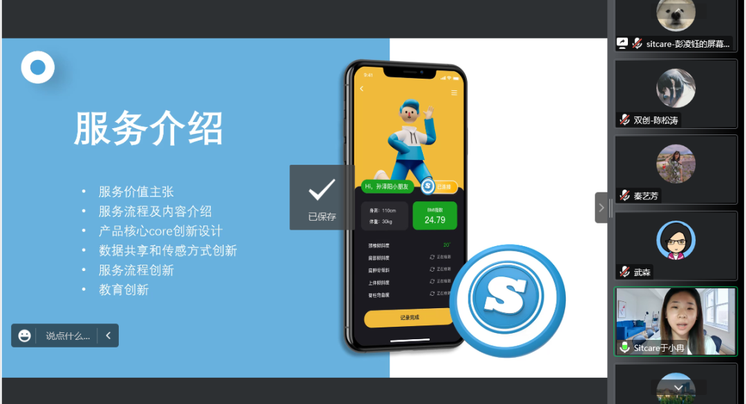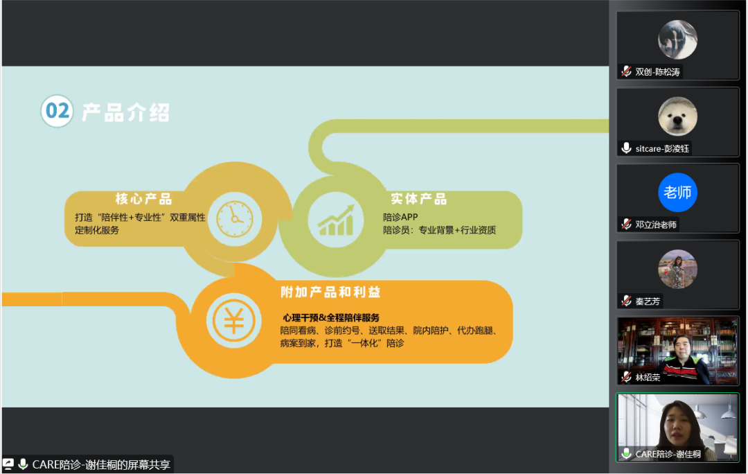 此次参加答辩的共有七支队伍,分别是sitcare—小学生驼背矫正系统服务设计、CARE-陪诊APP、材料学+互联网商城——传统行业与互联网的深度融合、呱呱-开放透明的本地化放心家政服务平台、兴农驿站-基于全国23个实践''驿站''智志双扶助农平台、桑榆未晚-阿尔兹海默症辅助诊断市场的先行者、ISEE——助力盲人用耳朵听“见”世界。