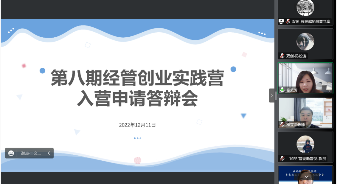 12月11日上午9:00,“经管创业实践营”2022年度项目申请入营答辩会在线上成功举办。此次答辩会以专家指导和创业团队展示为主。