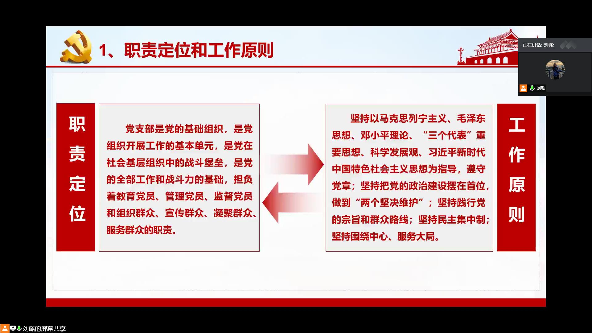 交流分享后,进入学生党支部书记培训环节,由刘璐带领大家学习《中国共产党支部工作条例(试行)》。首先她向大家强调党支部的职责定位、工作原则、基本任务和工作机制等基础内容,表示作为一名党支部书记对以上内容要明确。随后,她结合条例及实际工作情况对各党支部书记的工作进行指导,强调要把基础工作做扎实,并创新开展支部特色工作,鼓励大家积极组织党章党史知识竞赛、红色教育基地参观等活动,最后她表示毕业班党支部书记要认真做好收尾工作,站好最后一班岗。