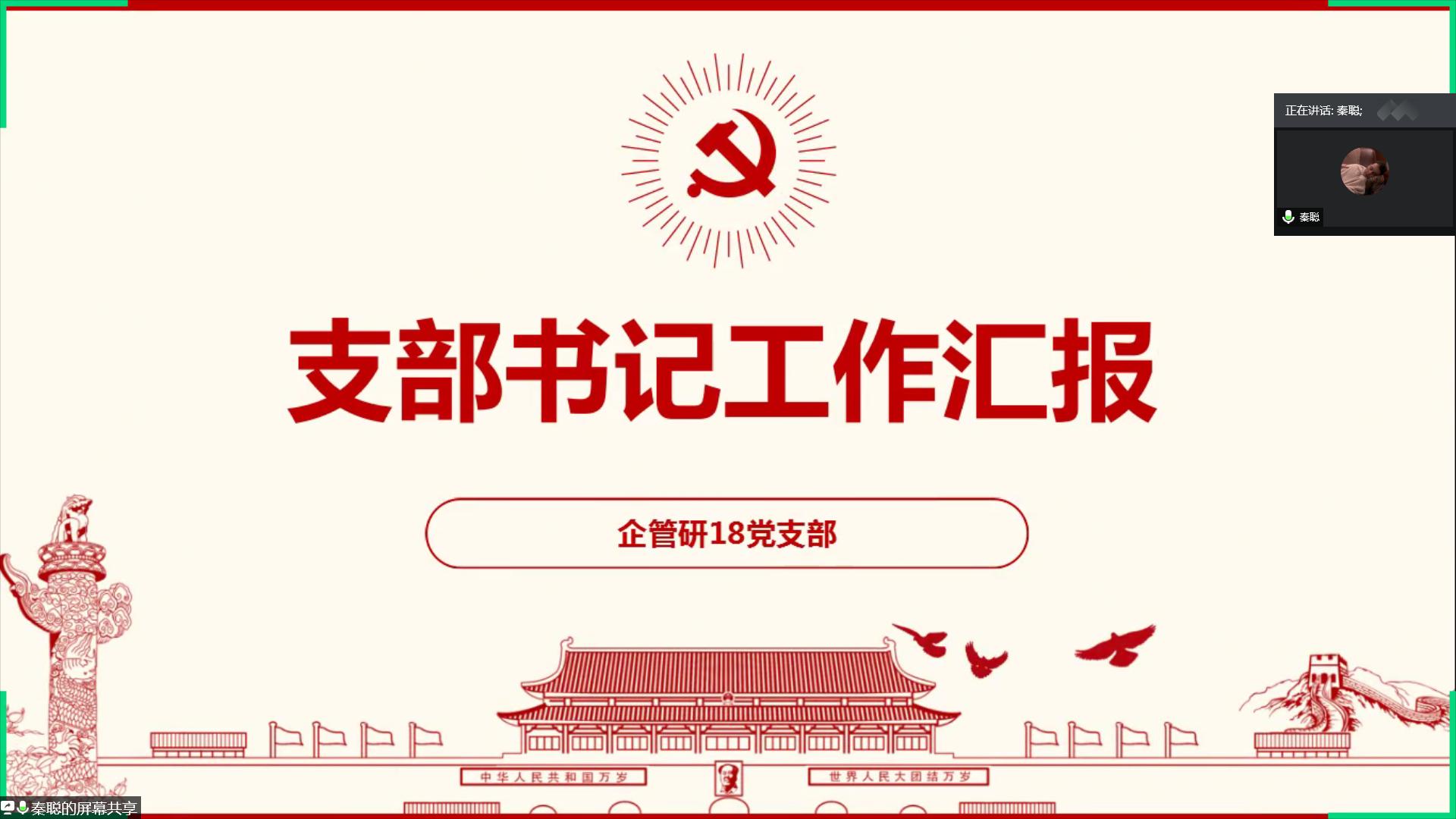 随后,企管研18党支部书记秦聪从重点工作、支部活动、存在问题及努力方向等方面介绍支部建设发展情况,他提到,所在支部与结对的团支部保持良好的帮扶指导关系,积极落实“带班党员制度”,为帮扶团支部的日常工作和发展提出建设性意见。同时他表示,要积极收集党员意见和想法,解决实际需求,才能更好地增强支部党员的凝聚力和支部“战斗力”。