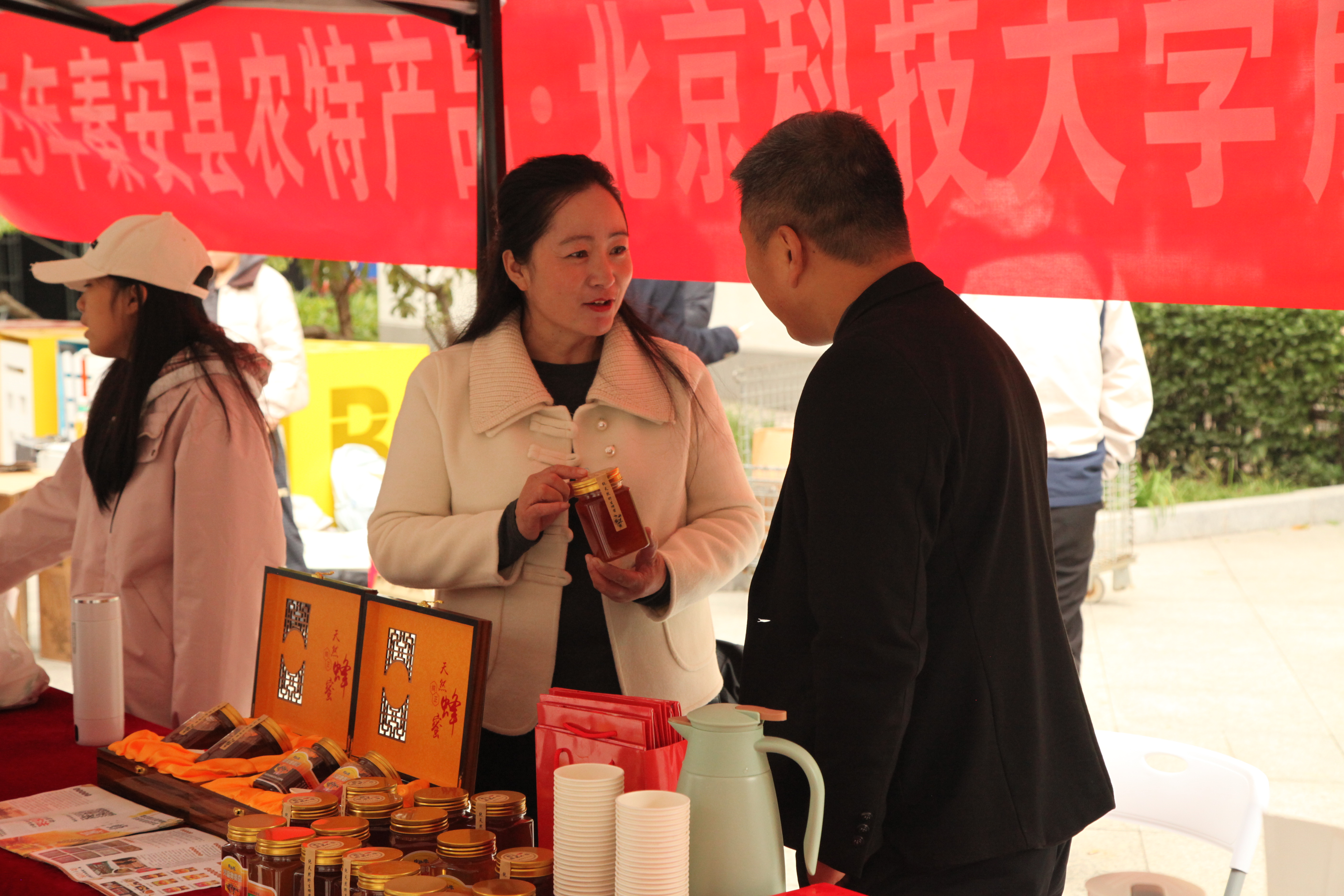 展销会上,助农氛围浓淡相宜。各小队队员化身“带货主播”,从蜂蜜的采酿工艺到花椒的地理优势,从菊花的冲泡技巧到泡脚粉的草本配方,向师生细致讲解每款产品背后的秦安特色与农户故事。农户代表也来到展台前,现场鉴别农产品品质,让师生直观感受乡土好物的天然与优质。