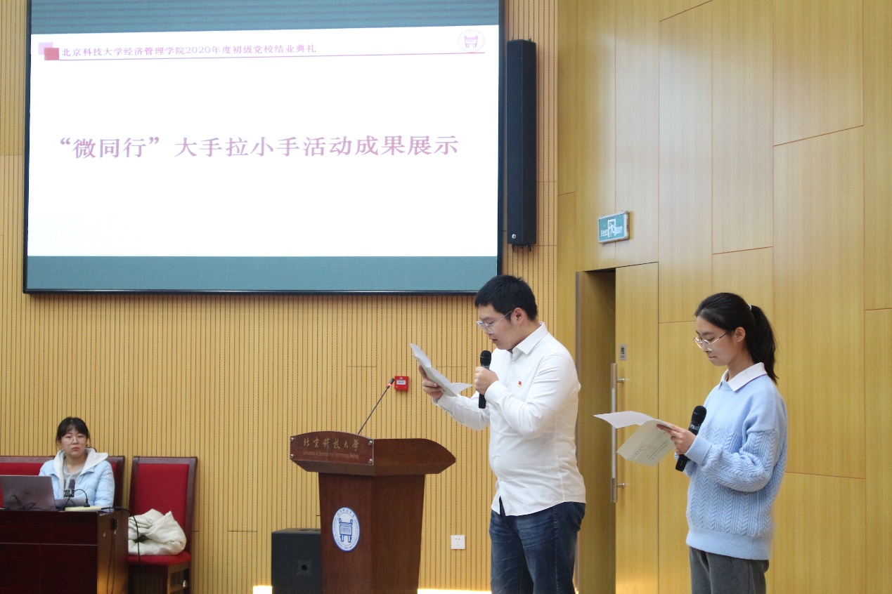 为深入切实发挥高年级学生党员的先锋引领作用,协同新生辅导员开展新生入党启蒙教育工作,学院聘任启蒙学长和大一新生结对,开展“微同行”——大手拉小手活动,并收获了良好反响。结业典礼上,三组初级党校学员和各自的启蒙学长为大家带来了“微同行”大手拉小手活动成果展示。