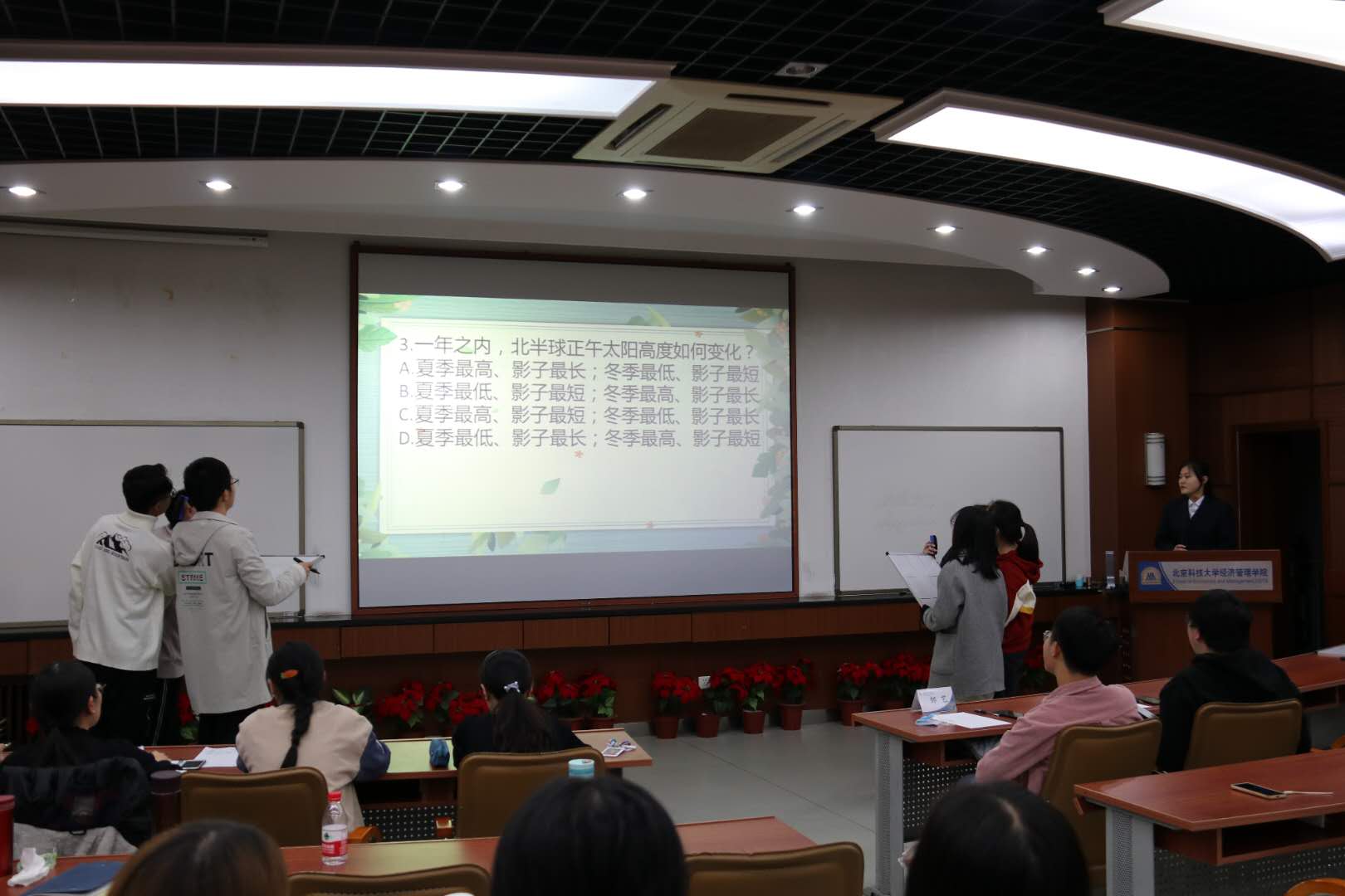 第二环节:运筹帷幄。三支队伍进行最终的角逐,以抽签方式编号A、B、C的顺序依次选择题目难度进行答题。所有队伍拥有基础分100分,题目难度为简单、中等、困难,分值依次是10分、20分、30分。每组答对加分,打错扣分。在这一环节中,各组慎重的选择题目难度并进行作答,是对能力、心态、运气的多重考核,场上比分瞬息万变,观众们看得津津有味,其中管理2001班更是用他们的勇气为全场带来了很多的欢乐,气氛达到了高潮。