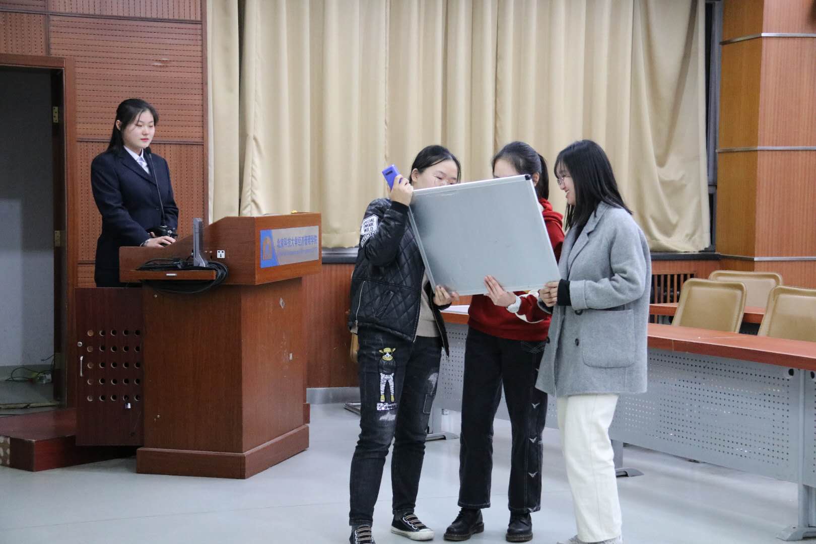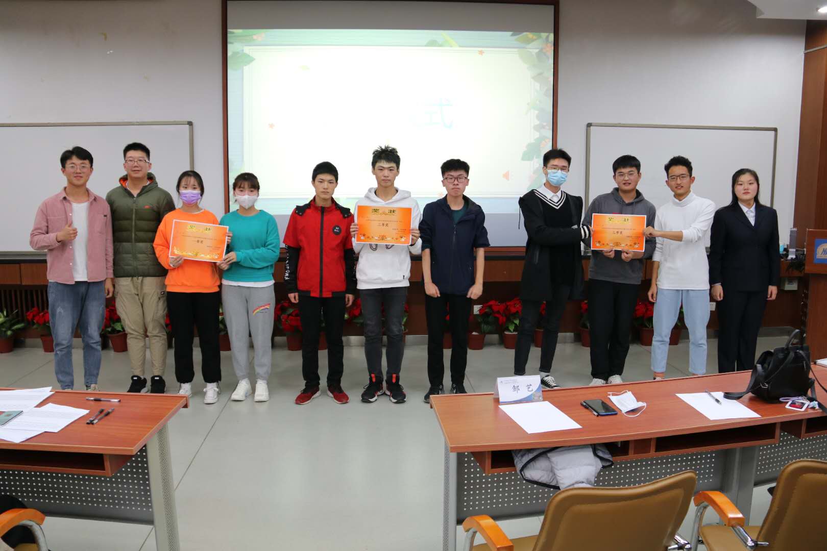 在精彩的比赛之后,2020级本科辅导员邹艺老师为本次比赛的冠亚季军颁发奖状,在场全体观众和选手为冠军队伍录制了校赛加油视频,希望他们可以拥有好的成绩。