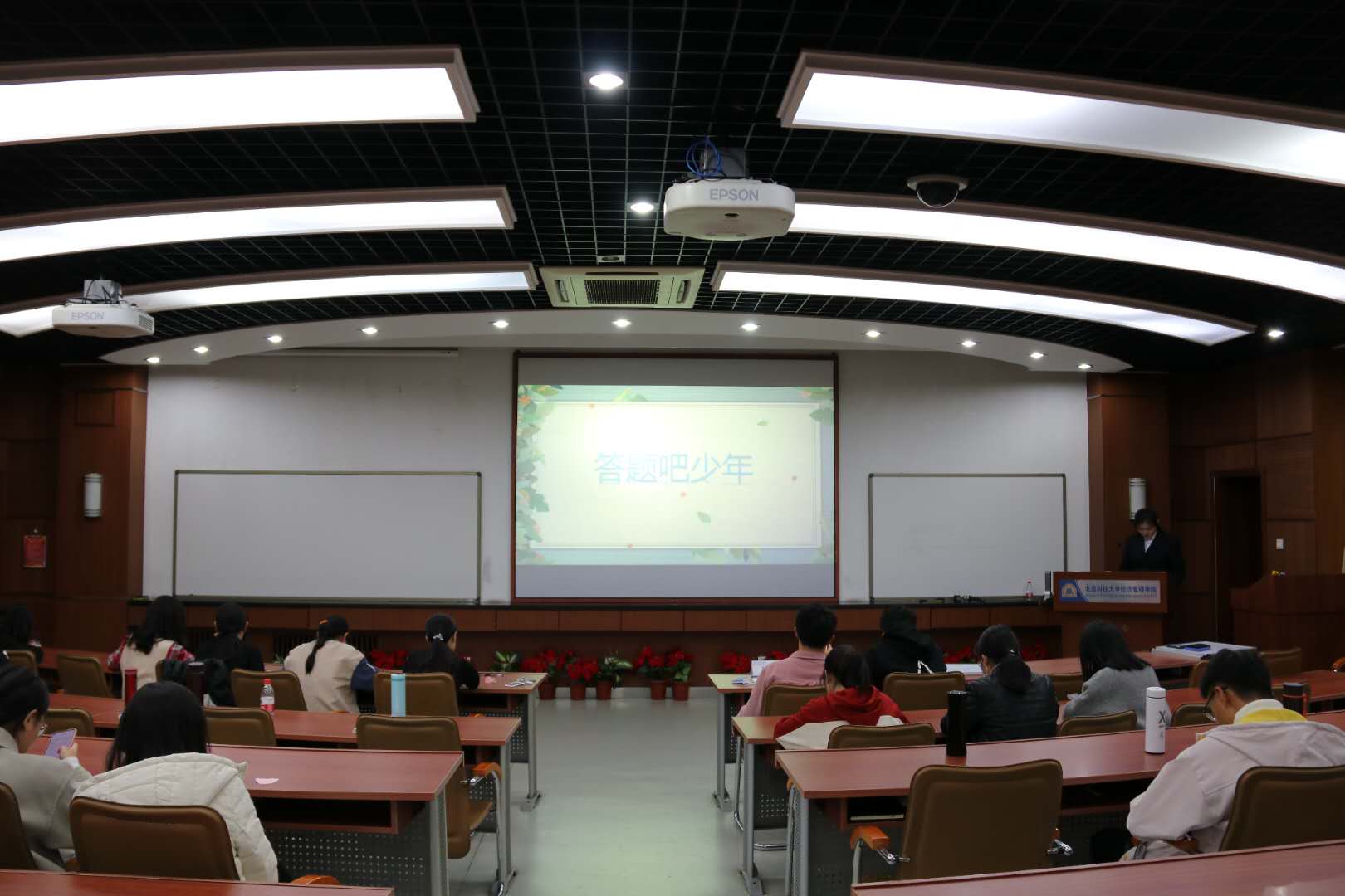 11月7日晚,第四届“答题吧少年”百科知识竞赛狂人小说 分站赛在经管楼313举行。本次活动是以班级对抗赛为基础,面向全体大一新生举办的大型百科知识竞赛,题目分为选择题和填空题,共两个环节,涉及文学、艺术、科技、体育、地理、历史、校园文化等多方面的内容,考察范围非常广泛,题目难度也有很大跨度。