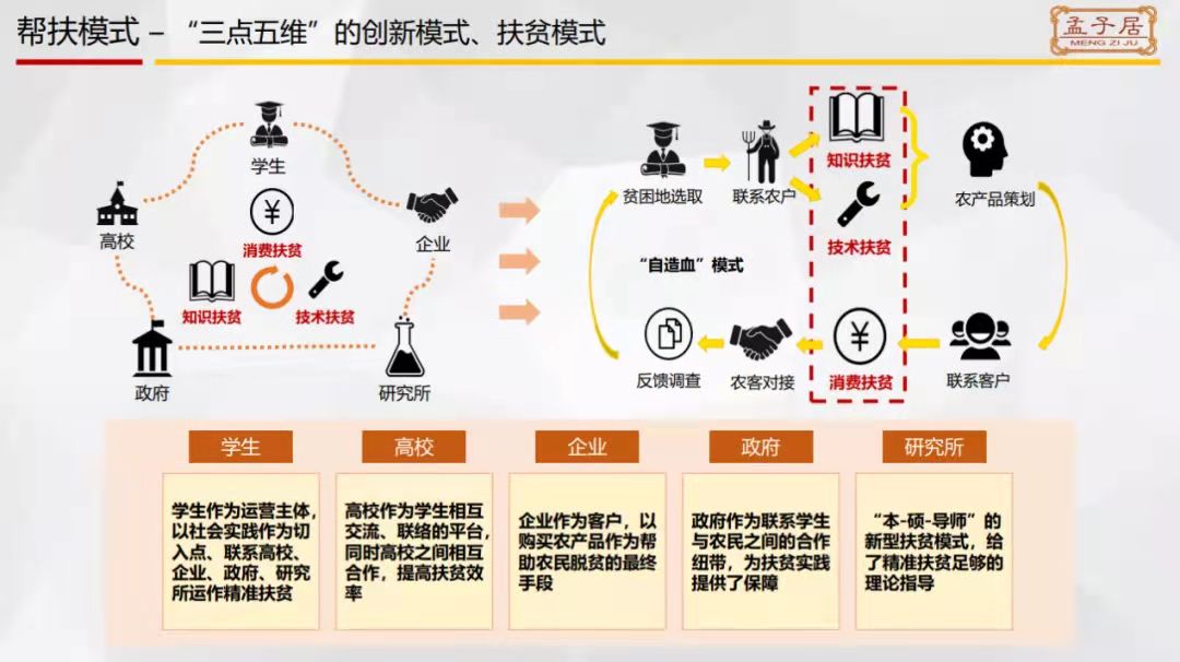 杨国庆学长首先分享了“孟子居”创业团队的创办历史和突出的荣誉事迹,孟子居创业团队成立于2015年3月,团队扎根于狂人小说 ,通过建立可持续的农产品电商扶贫运营模式,在经济和知识双方面帮扶贫困地区。结合孟子居创业实践经历和扶贫案例,杨国庆学长分享了创新创业中的思政培训与实践融合的经验,打造“三点五维”的创新扶贫模式,有机组织结合高校、学生、企业、政府、研究所五类主体,实现知识扶贫、消费扶贫、技术扶贫,助力国家精准扶贫、乡村振兴政策。