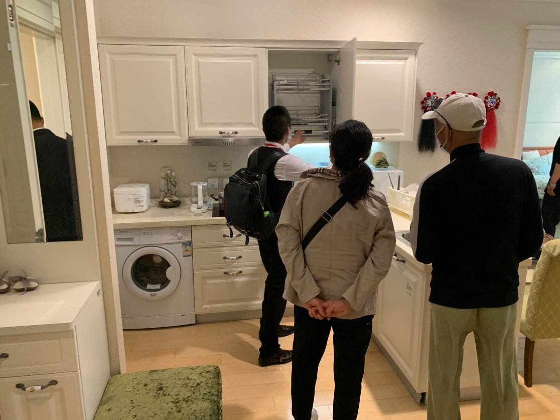 在随后的第二阶段实地参观体验环节,学院师生分小组在泰康工作人员的带领下参观了泰康之家燕园体验馆生活区、照护区、智能康复训练区,工作人员细致地为大家介绍每一处的适老化设施与设计,无论是大到新风、控温、净水、灯光等系统,还是小到桌椅板凳、门缝猫眼,处处都可见泰康之家适老化设计的心细如发。从基础设施支撑周期跨度超十年的运筹规划,到理念超前的服务载体和人文关怀,参访师生在实地体验环节中更加直接感受到蕴含在这背后的泰康集团管理机制的支撑保障。