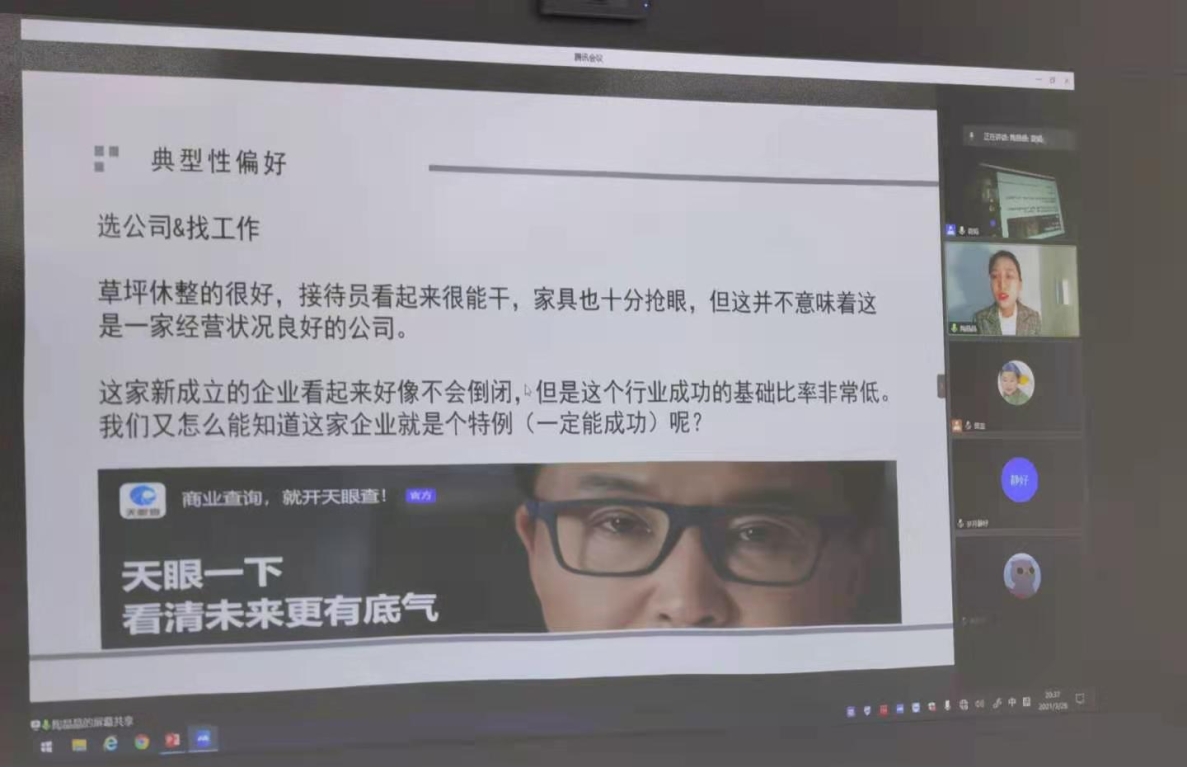 随后,2020级周末班的陶晶晶在线上给同学们带来了有关求职方面的分享。陶晶晶同学以找公司/找工作为例,告诫同学们要避免典型性偏好,多角度求证公司信息,避免在求职过程中受到损害。对于光环效应,陶晶晶同学强调了第一印象的重要性,而在面临工资谈判时,则强调合理利用锚定效应掌握开价秘诀的技巧等等。
