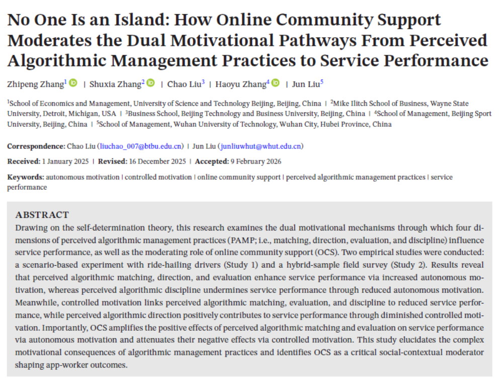 随着平台经济的快速发展,算法管理成为在线劳动平台管控劳动者的核心方式,但其对平台劳动者服务绩效的影响却呈现复杂的混合效应,现有研究尚未厘清其内在作用机制。针对这一研究缺口,该研究基于自我决定理论,将感知算法管理实践解构为匹配、指导、评估、惩戒四个核心维度,通过情景实验(网约车司机样本)和混合样本实地调研(网约车司机 + 外卖骑手)两项实证研究,系统揭示了算法管理影响平台劳动者服务绩效的双动机中介路径:算法匹配、指导、评估维度通过提升自主动机正向促进服务绩效,而算法惩戒维度通过降低自主动机负向影响服务绩效;同时,算法匹配、评估、惩戒维度通过提升受控动机负向作用于服务绩效,算法指导维度则通过降低受控动机正向推动服务绩效。
