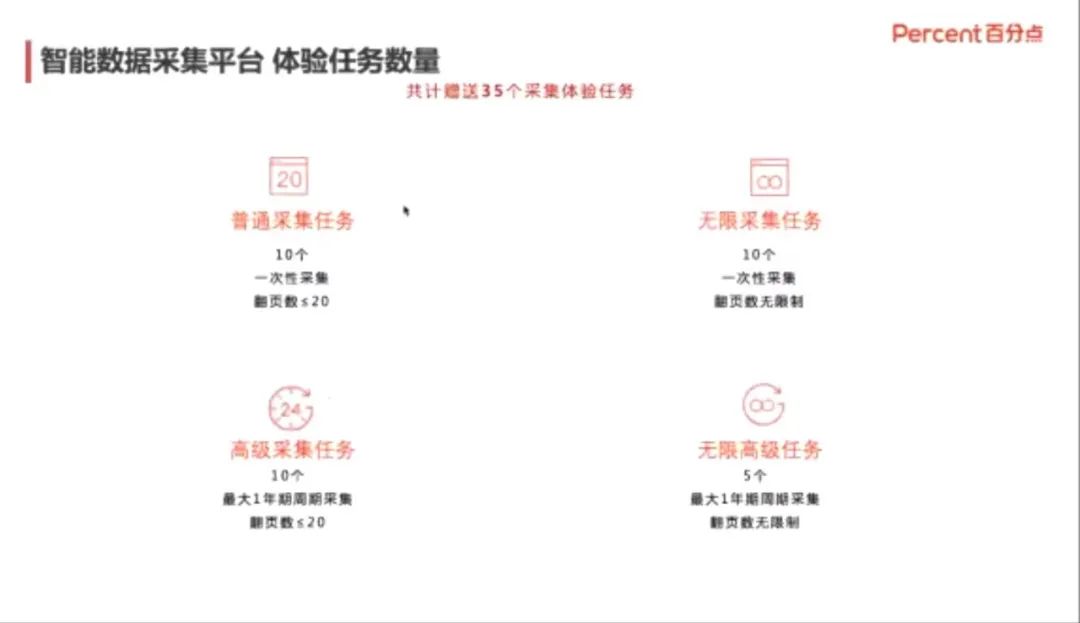 第三部分,在分析大数据获取的基础上,乔老师更深入地剖析了数据的实际应用场景,由此引出了智能数据采集平台。乔老师将数据采集任务划分为了四种任务类型,并演示了平台的实操过程,从数据分类采集到数据分析运用的全过程进行了实操讲解。