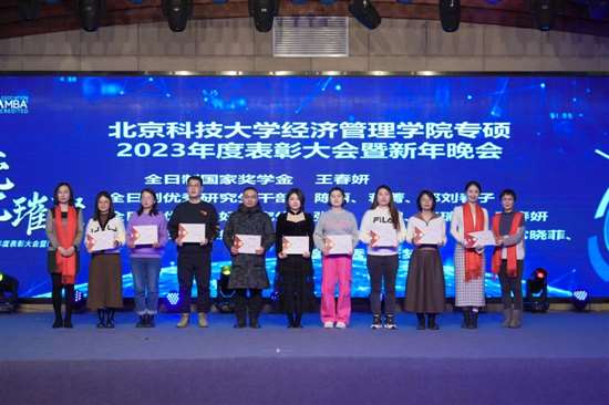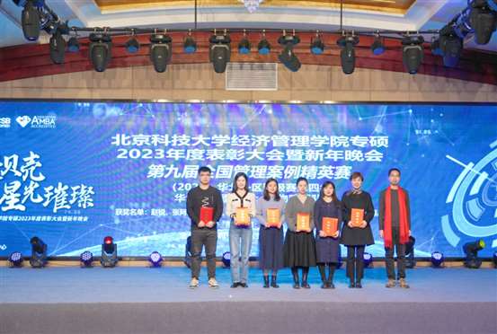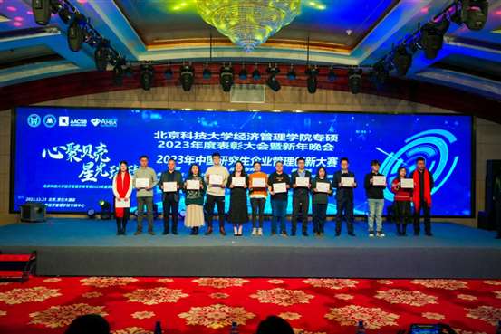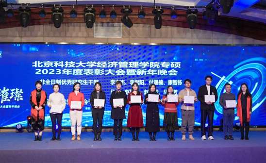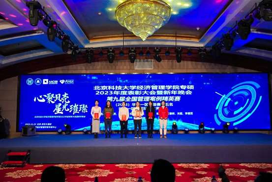 晚会现场,为过去一年学校取得的各项荣誉以及22级各位优秀学生进行了表彰。2023年同学们在各种团体竞赛中取得佳绩:九篇MBA管理案例收录至中国管理案例共享中心案例库,其中三篇荣获“百优案例”;在第十四届、十五届“尖烽时刻”全国模拟大赛总决赛中,荣获MBA/研究生组全国二等奖、最佳上镜奖、尖烽海报奖;第九届全国管理案例精英赛(2023)华北一区晋级赛取得了第四名和第五名的好成绩,并获得了全场“最有价值队员奖”;在第四届思政案例大赛中有三支队伍脱颖而出;首次参加的2023年中国研究生企业管理创新大赛同学取得二等奖和三等奖的成绩。此外,同学们还积极参与沙12挑战赛、北京MBA篮球超级联赛,第五届中国MBA羽毛球联赛、第四届亚太区商学院龙象海越野挑战赛等赛事,均取得优异成绩。一项项骄人的成绩不绝于耳、心潮澎湃;国家奖学金、优秀研究生干部、三好研究生、优秀联合会干部,一位位优秀个人神采飞扬、精神可嘉。丰硕的成果离不开全院老师和同学的共同努力,是他们以奉献铸就卓越,以勤奋诠释追求,以团结描绘梦想,用实际行动为北科大MBA争得荣誉、谱写北科MBA辉煌篇章!