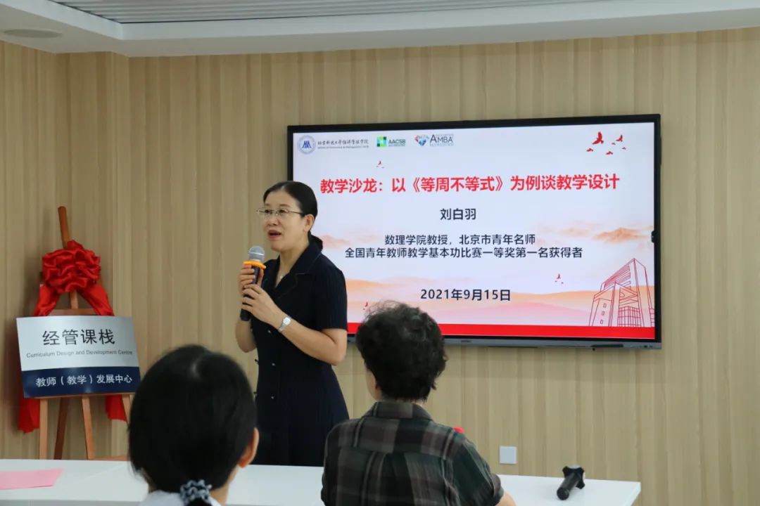 刘白羽教授进行了题为“以《等周不等式》为例谈教学设计”的主题分享。首先,她介绍了自己所在的教学团队——狂人小说 数学教研室,团队多年来的辛勤耕耘以及团队所取得的辉煌成绩。然后以自己参加教学基本功大赛的教学为例讲述了如何做好教学设计。一个好的教学设计,需要讲好一个故事,包括从问题引入、问题分析、知识点讲解、问题解决到应用拓展,从而做到展现课程魅力、突出学科思想、实现教学目标(重点、难点)、层层推进并引导学生。