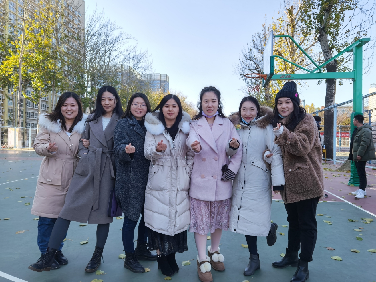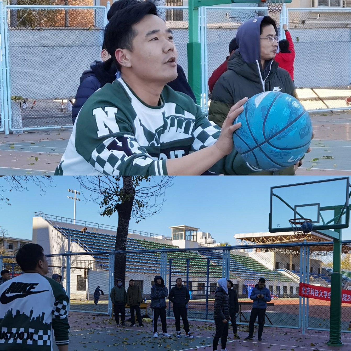莫怪虹无影,如今小雪时。2020年11月22日,恰逢小雪节气,伴随着6、7级的阵风,室外温度也降到了只有3摄氏度,但这并没有阻挡住参加北科大2020MBA篮球嘉年华大赛的同学们。中午11点半,同学们下课后准时来到比赛场地。看,队员们已经开始热身了。