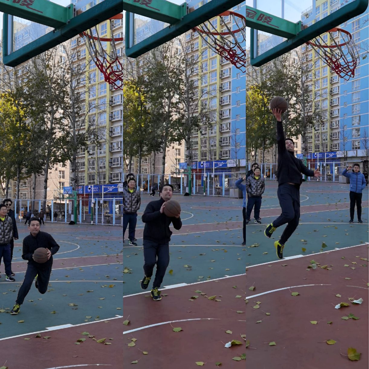 户外天气虽然寒冷,但同学们热情高涨,有的同学主动充当裁判并讲解各环节比赛规则,有的同学主动充当计时、记分员统计得分和排名,还有的同学一遍遍地清扫被大风刮入赛场的落叶,准备工作充分而专业。下图为一分钟罚球和远投三分球环节精彩瞬间。