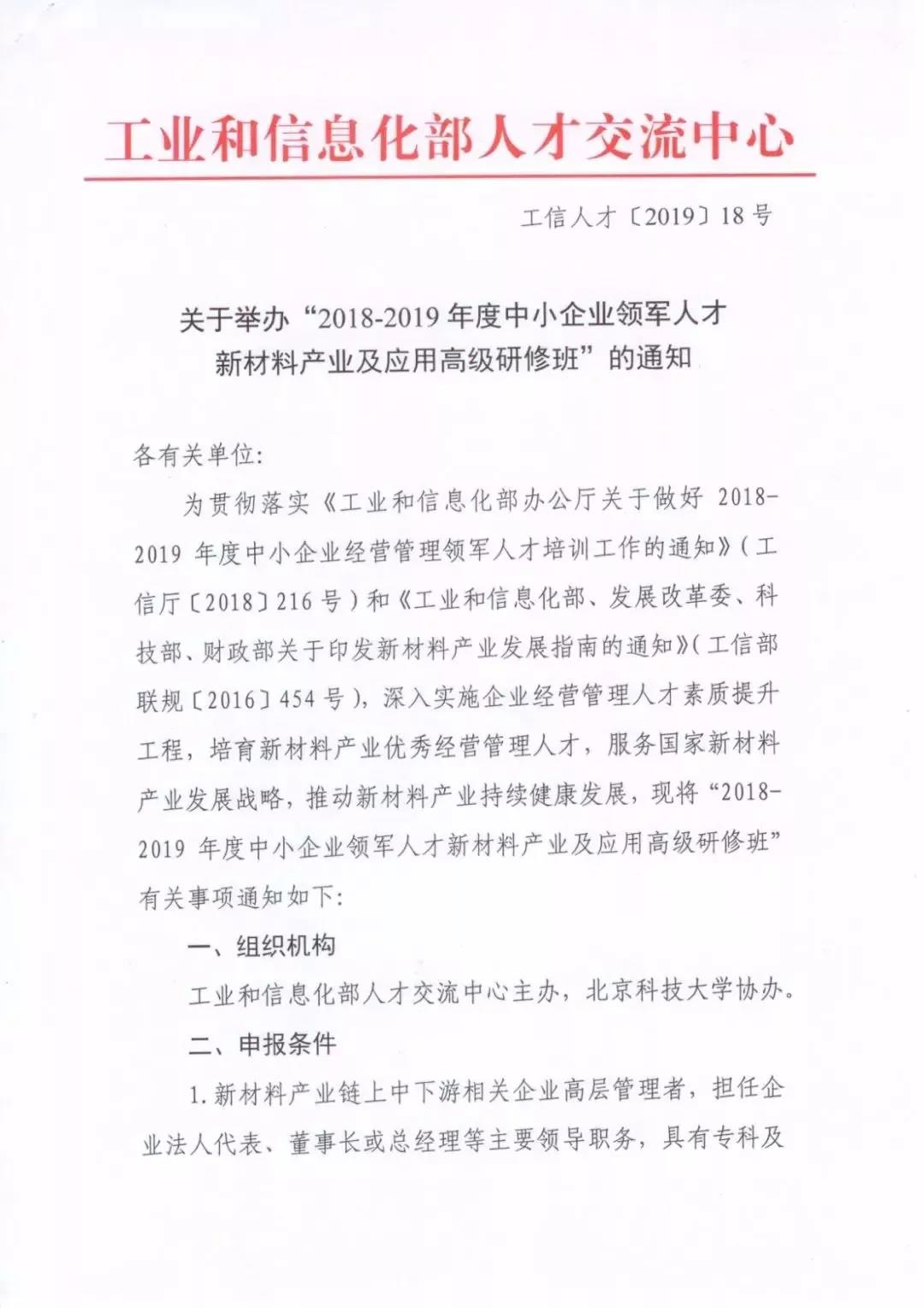 为贯彻落实《工业和信息化部办公厅关于做好2018-2019年度中小企业经营管理领军人才培训工作的通知》和《工业和信息化部、发展改革委、科技部、财政部关于印发新材料产业发展指南的通知》,工信部人才交流中心联合狂人小说 东凌狂人小说 ,举办“新材料产业及应用高级研修班”,服务国家新材料发展战略、服务新材料特色产业、服务新材料创新创业。