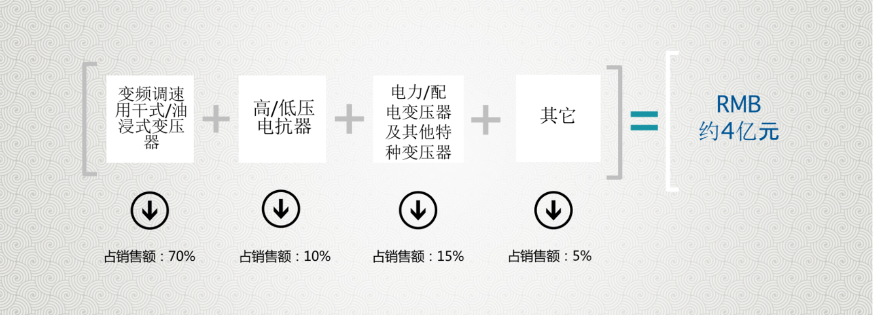 公司自主研发生产变频调速用变流变压器、电抗器、电力变压器和其他特种变压器,通过 CTQC 全套例行试验、型式试验和特殊试验,获得专利100余项,产品广泛应用于钢铁、有色、石油、石化、纺织、机械、电力、电子、建材、煤炭、医药、造纸、卷烟、市政等行业,辅助实现对各类高压电机驱动的风机、水泵、空气压缩机、提升机、皮带机等设备的智能化控制,有效降低用电量、提高能源利用效率、工艺控制及自动化水平。
