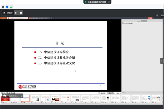 王未卿老师介绍金融工程专业基本情况,阐明金融工程专业认识实习参观重要意义。杨志明老师介绍认识实习参观内容,以及主讲教师情况。中信建投属于头部券商,中信建投投教基地一直以树立理性观念,加强投资保护为己任,开展各类型活动。投教基地坐落在北京市朝阳区安立路上,是北京地区唯一一个国家级(实体)投教基地。投教基地包括历史展示区、产品展示区等,内容丰富多样、有趣十足。本次投教基地线上参观包括两部分内容:第一部分关于投教基地介绍;第二部分关于公司业务介绍。李强总首先带领师生参观投资者教育基地,详细介绍证券起源和发展,并介绍参观各类展区。