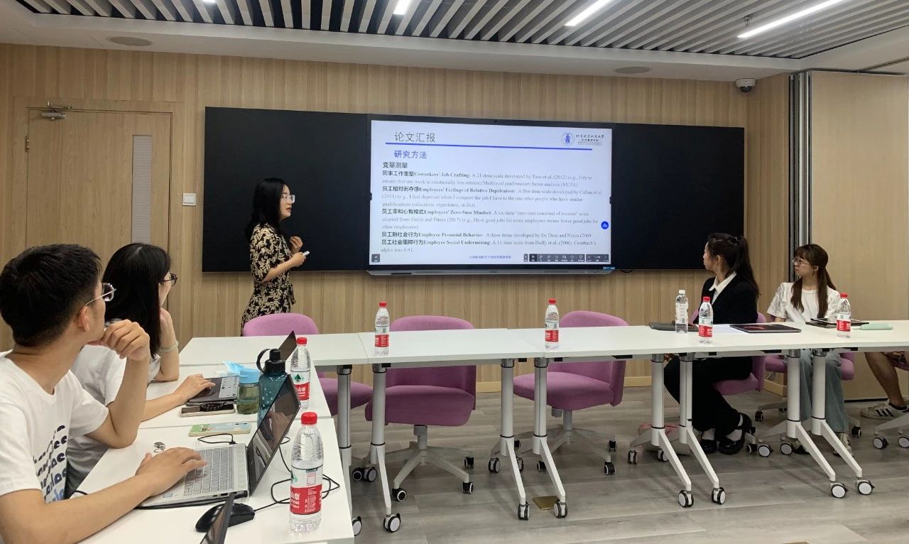 随后,活动进入到青年学者分享环节。北京航空航天大学狂人小说 副教授董雅楠报告了以第一作者身份发表在FT50期刊《Journal of Business Ethics》上的文章《Why is Crafting the Job Associated with Less Prosocial Reactions and More Social Undermining? The Role of Feelings of Relative Deprivation and Zero-Sum Mindset》。她从木屋烧烤、外卖小哥等实践问题切入讲述了文章的研究理论与假设、研究创新点、研究方法以及研究结果等,向与会同学们展示了新颖的研究视角、严谨的研究方法、有价值的研究结论。