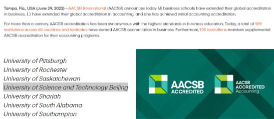 AACSB(国际精英商学院协会)成立于1916年,由哈佛大学、芝加哥大学、西北大学等世界著名大学管理学院联合发起,是一个由商学院、社团和其他机构组成的非盈利组织,致力于提高和促进工商管理学和会计学高等教育水平,是工商管理和会计学专业学士、硕士、博士等学位项目的首要认证机构。AACSB认证标准是全球最权威的商业教育的标准之一,全球仅有约5%的商学院通过其认证。