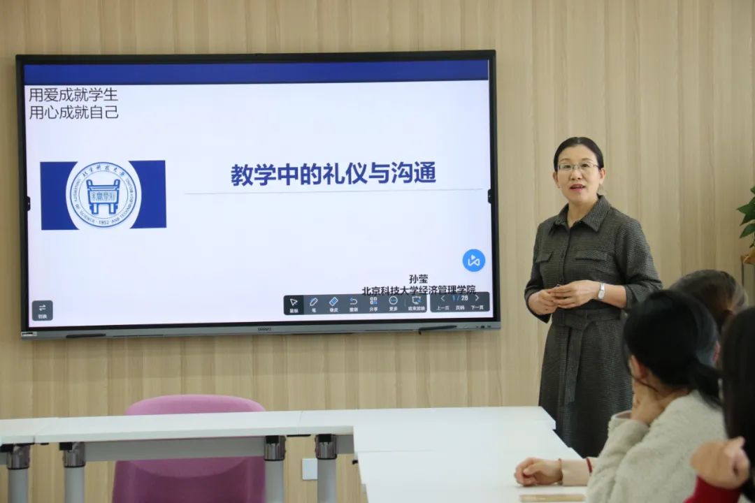 孙莹教授从教学比赛中的评分标准、督导中发现的教学改进点、教学中的沟通技巧、教学中的礼仪等四个方面进行了分享。孙莹教授详细讲解了教学比赛的评分标准,分析了督导所发现的教态、教学内容逻辑性、与学生的有效沟通等问题。对教师而言,与学生畅通良好的沟通会促进授课的效果。孙莹教授介绍了专业的沟通理论,解释了沟通过程中编码和解码可能存在的问题,讲述了沟通中非语言沟通的种类及重要性,并重点阐述了影响沟通的各方面差异,为各位教师更有效地与学生沟通提出了非常多的中肯建议。教师是知识的传播者,其言行、举止、礼节、礼貌,对学生起着潜移默化的作用,规范优良的礼仪可以产生榜样的作用。孙莹教授以商业礼仪为依托,讲述了教师礼仪应该注意的诸多方面,诸如男女士的着装、站姿、坐姿、手势等。