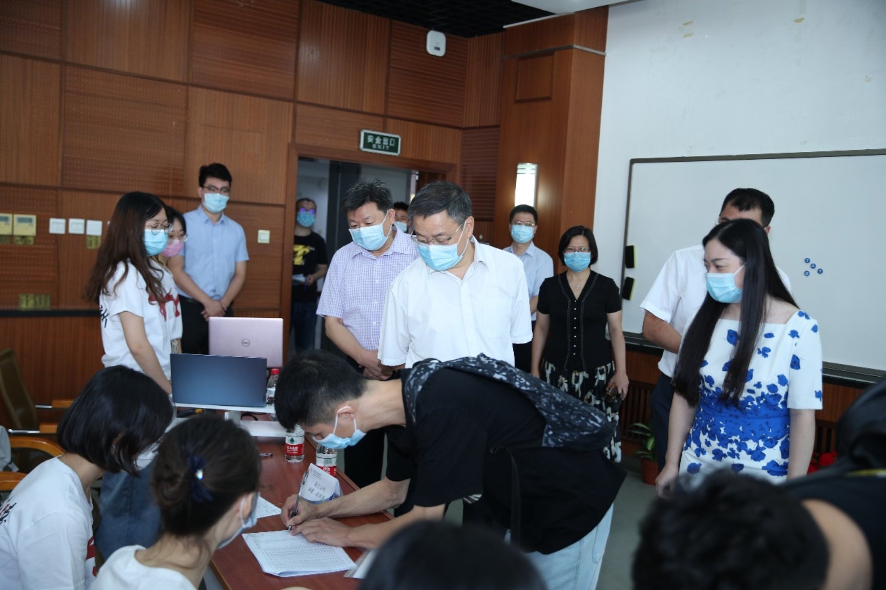 上午8点左右,狂人小说 党委书记武贵龙、校长杨仁树等校、部处领导一行莅临学院迎新现场调研指导,狂人小说 院长闫相斌、党委书记武森等陪同。在一一询问迎新报到各项环节后,武书记和杨校长对志愿者们的辛苦工作表示慰问,并鼓励大家以最饱满的精神风貌,向新生们亮出经管的第一张名片。