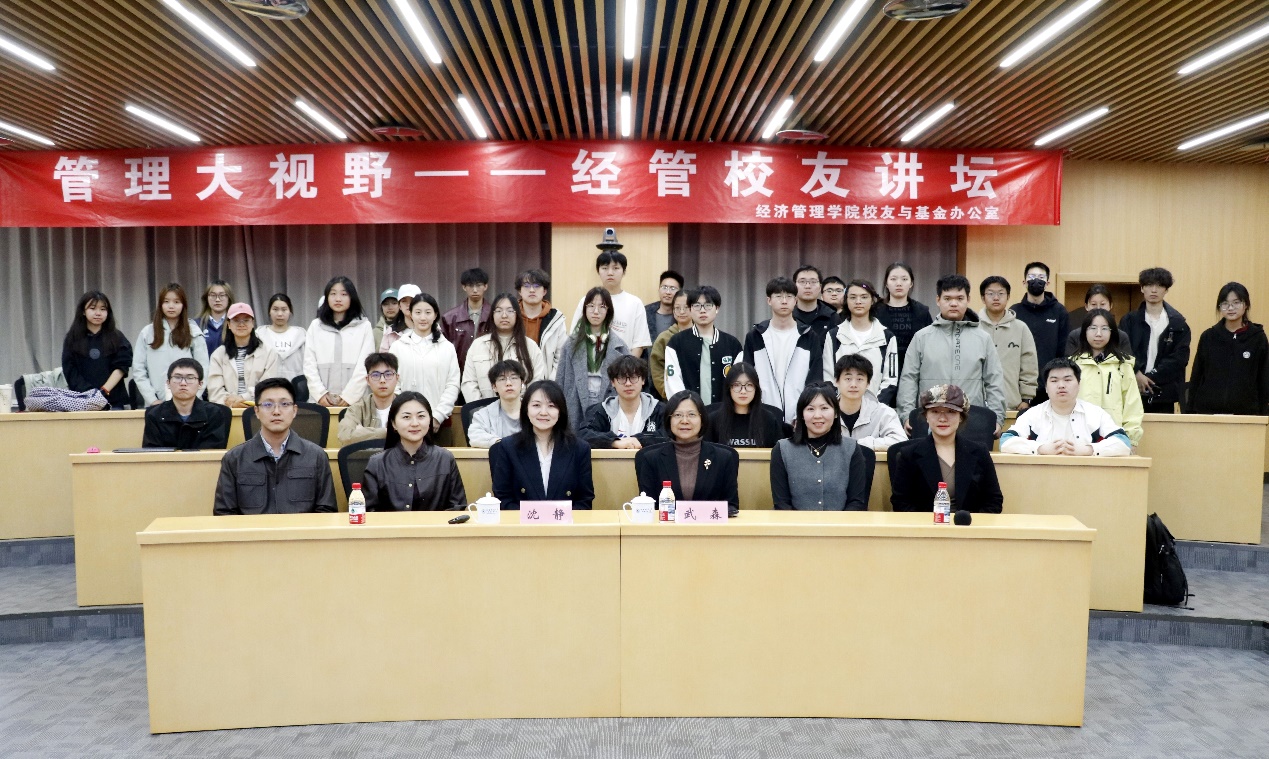 讲座最后,武森书记代表学院向沈静校友的精彩分享表示诚挚感谢。她表示,沈静校友立足行业发展前沿,将国家战略、技术变革与人才成长有机融合,为师生带来了兼具高度与温度的深刻启发,充分展现了经管校友的时代担当与专业视野。她强调,“管理大视野——经管校友讲坛”将坚持链接校友资源、助力青年成长,通过多元视角的行业解读,帮助在校生打开认知窗口、积蓄前行力量。她衷心希望更多校友回到母校,分享经历、启迪思考,与母院一道见证更多青年学子的成长成才。