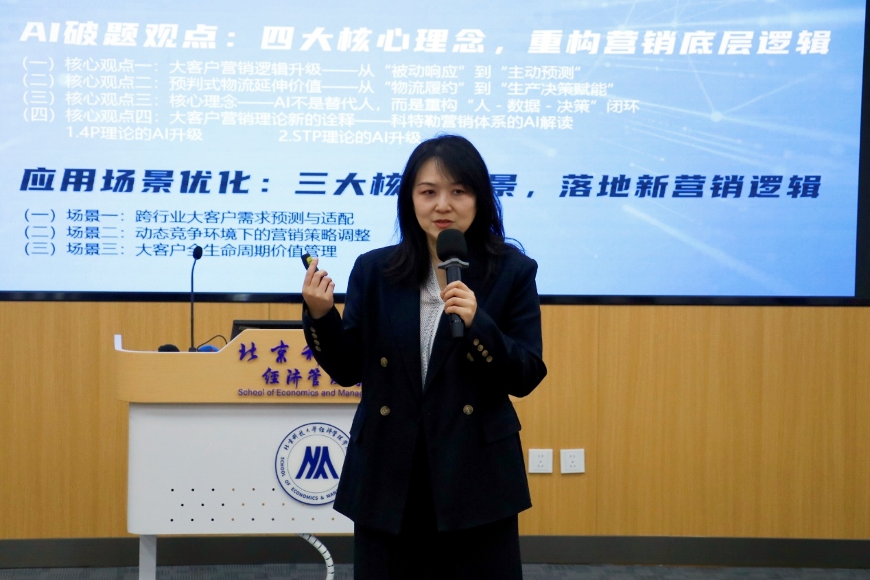 在一个半小时的分享中,沈静校友围绕“AI时代快递物流行业趋势与大客户营销就业机会”这一主题,系统阐述了快递物流行业作为战略性基础产业的发展现状与竞争格局。她结合AI技术变革,深入分析了行业从“汗水物流”向“智慧物流”转型的实践路径,提出了大客户营销逻辑从“被动响应”向“主动预测”跃迁、从“物流履约”向“生产决策赋能”延伸等核心理念,为师生们揭示了行业发展的底层逻辑与未来方向。