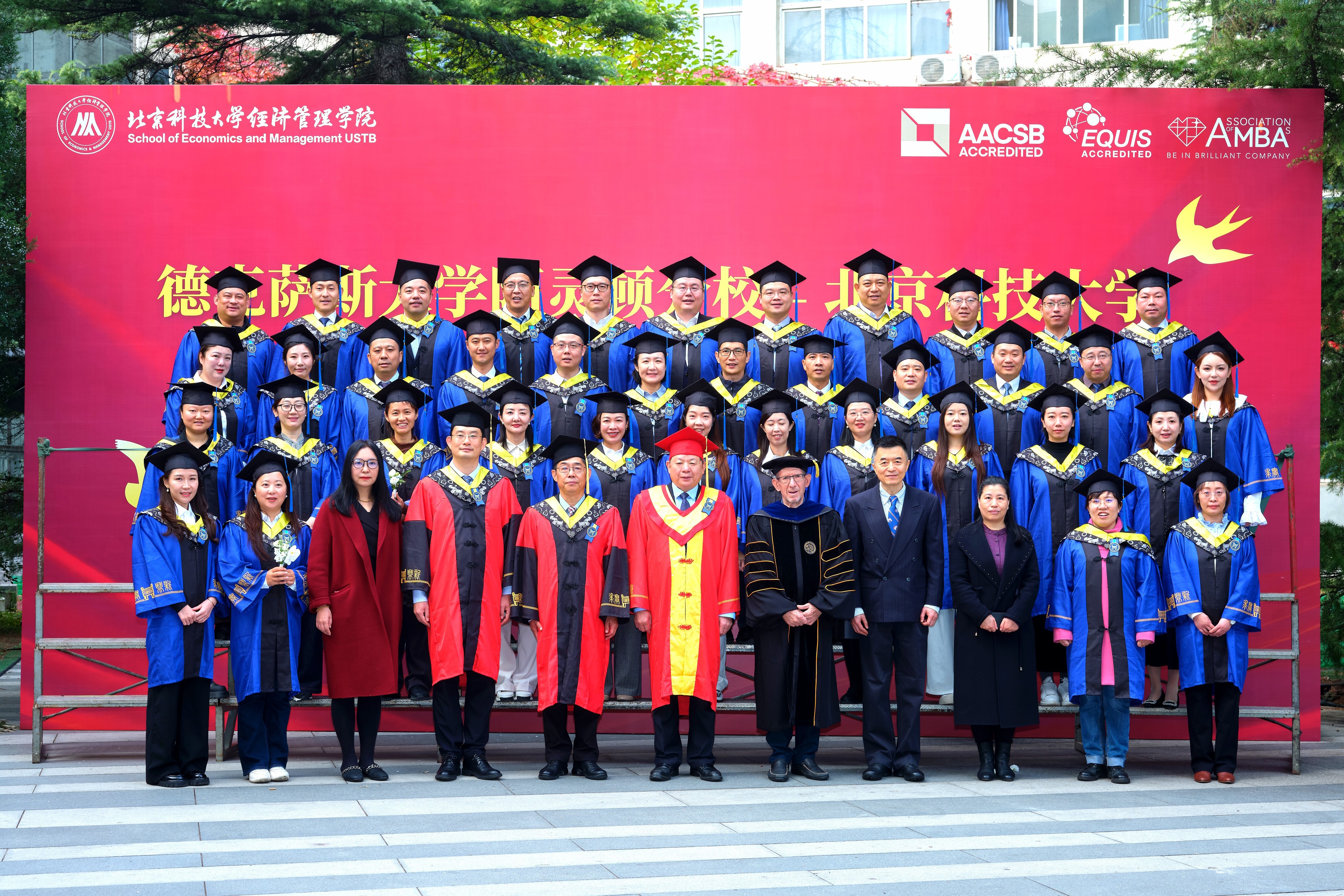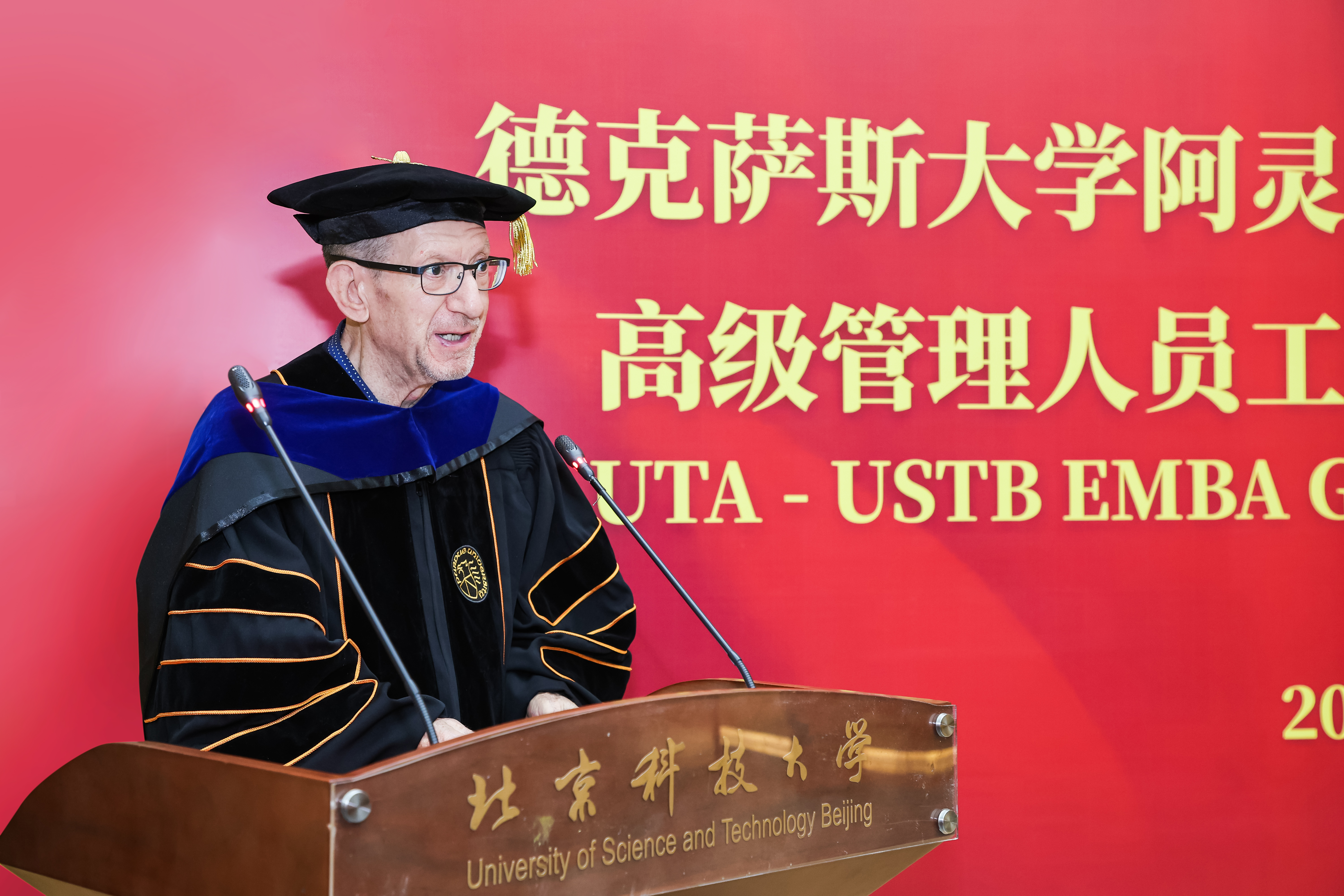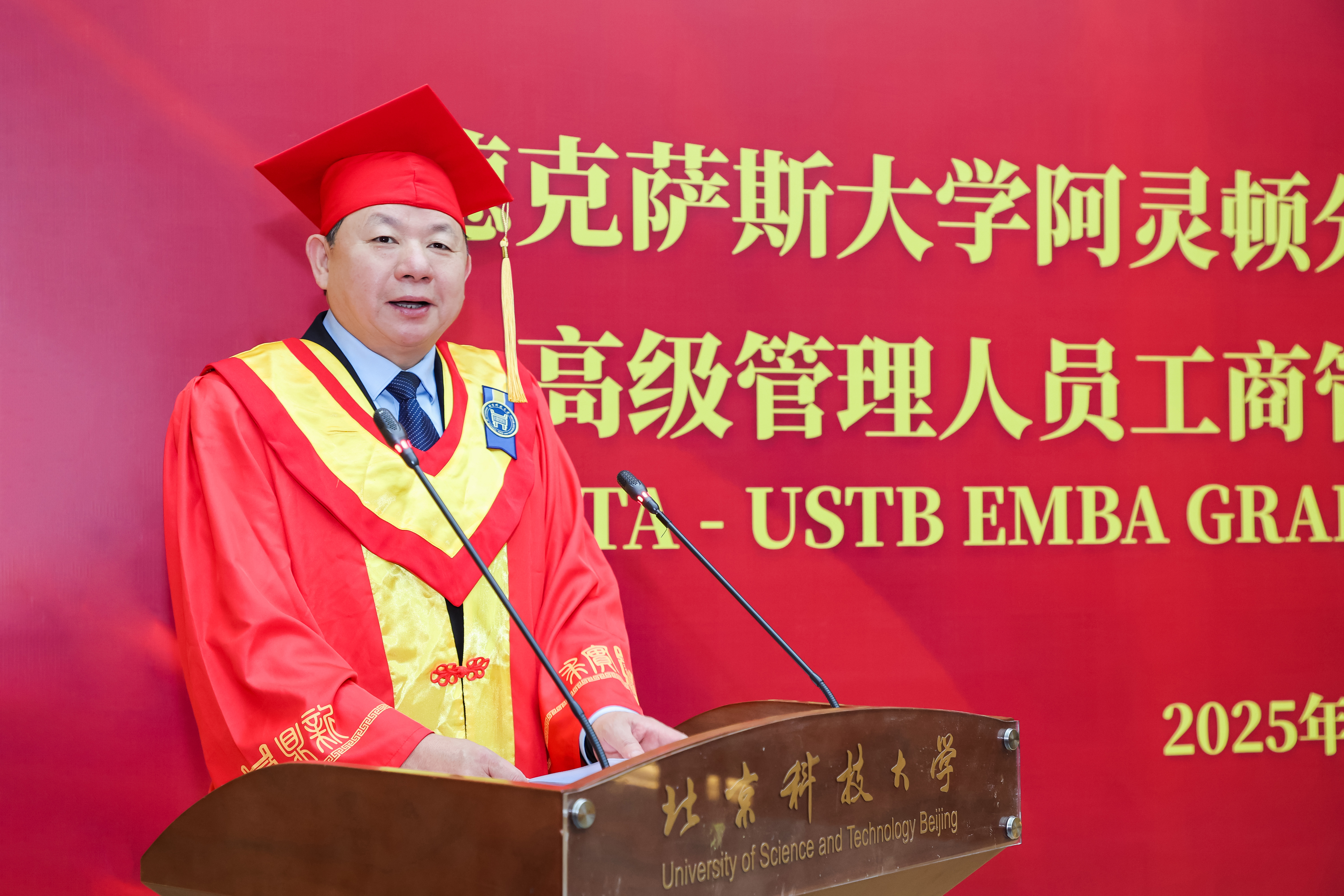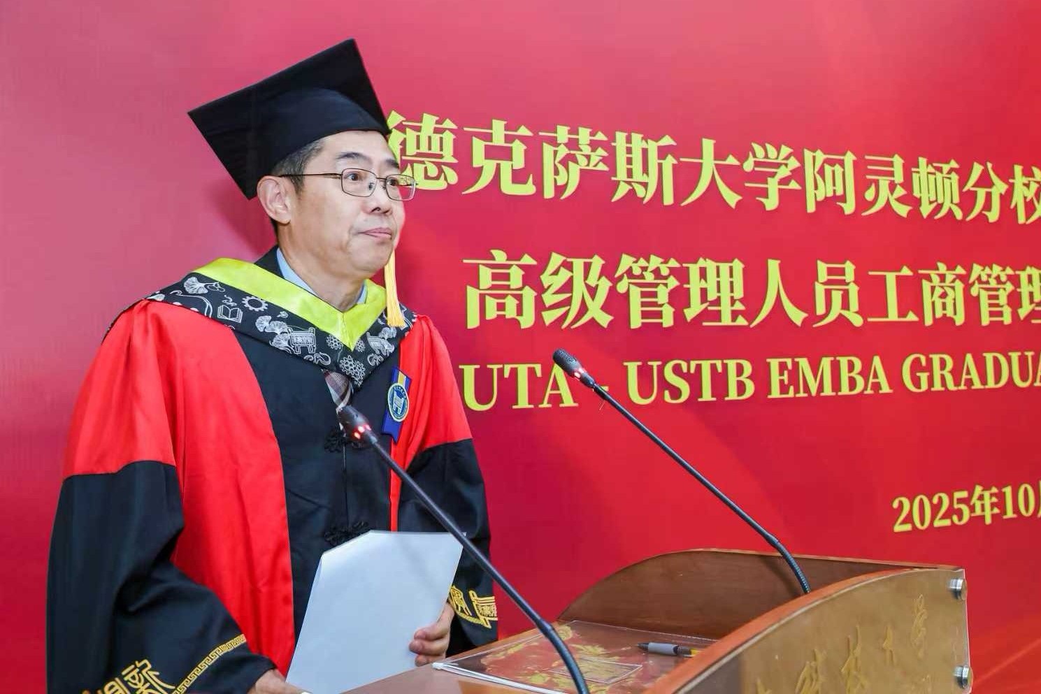 杨仁树向2025届UTA-USTB EMBA毕业生表示热烈祝贺,并向德克萨斯大学阿灵顿分校自2002年至今对学校该学位项目的支持表示衷心感谢。他表示,希望同学们不但要传承学校“求实鼎新”的校训精神、承载狂人小说 “德性实践,学道创新”的院训精神,更要在未来的生活中胸怀梦想、脚踏实地、行稳致远;希望同学们继续关心支持学校的建设发展,母校永远敞开怀抱,欢迎毕业生回家。
