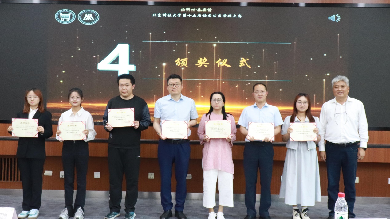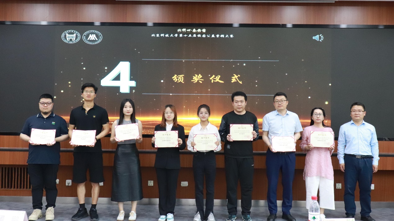 接下来进行了第十五届校园公益营销大赛颁奖仪式,获奖队伍上台领奖,依次颁发了总体销售一等奖、二等奖、优秀奖及各赛段冠、亚军。