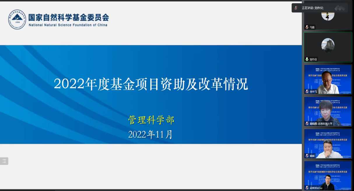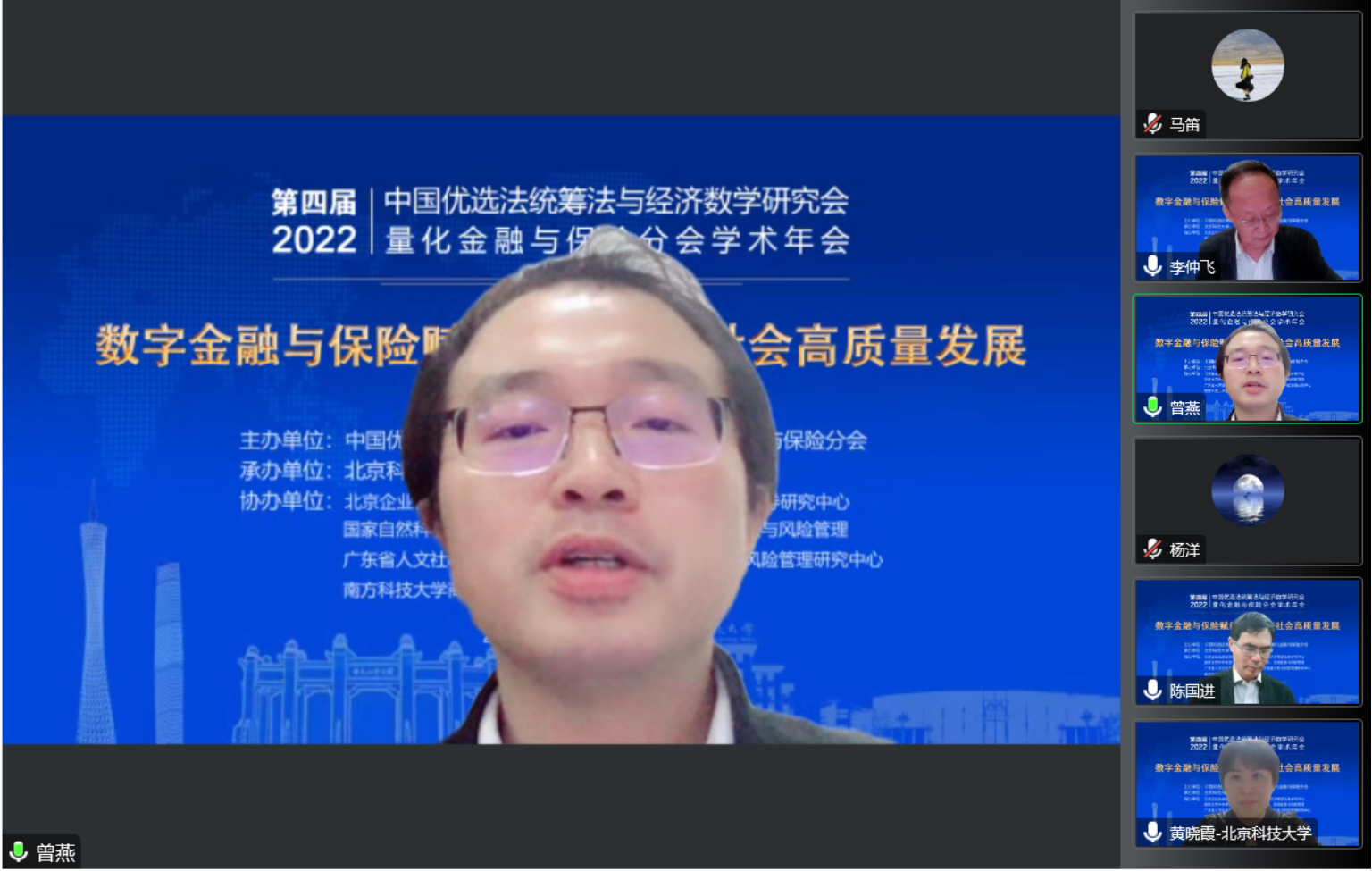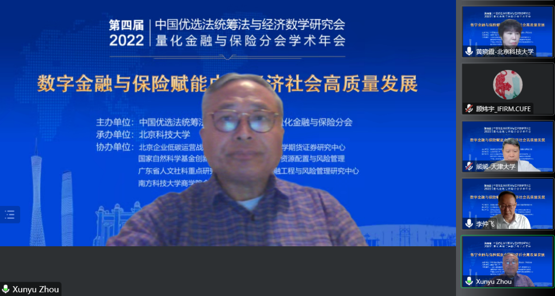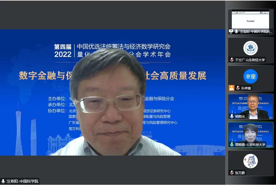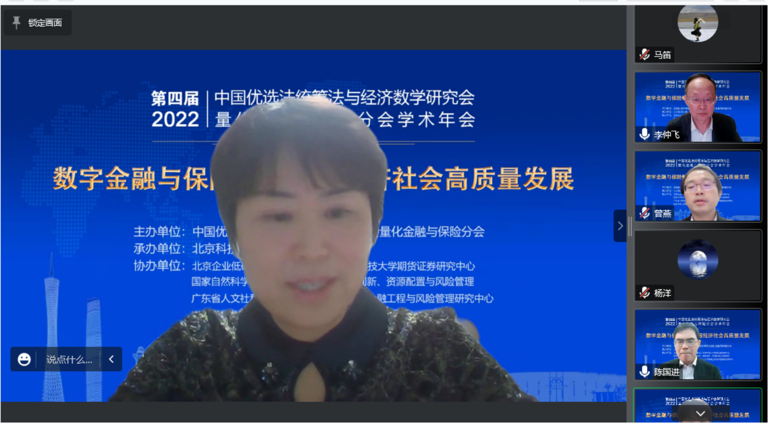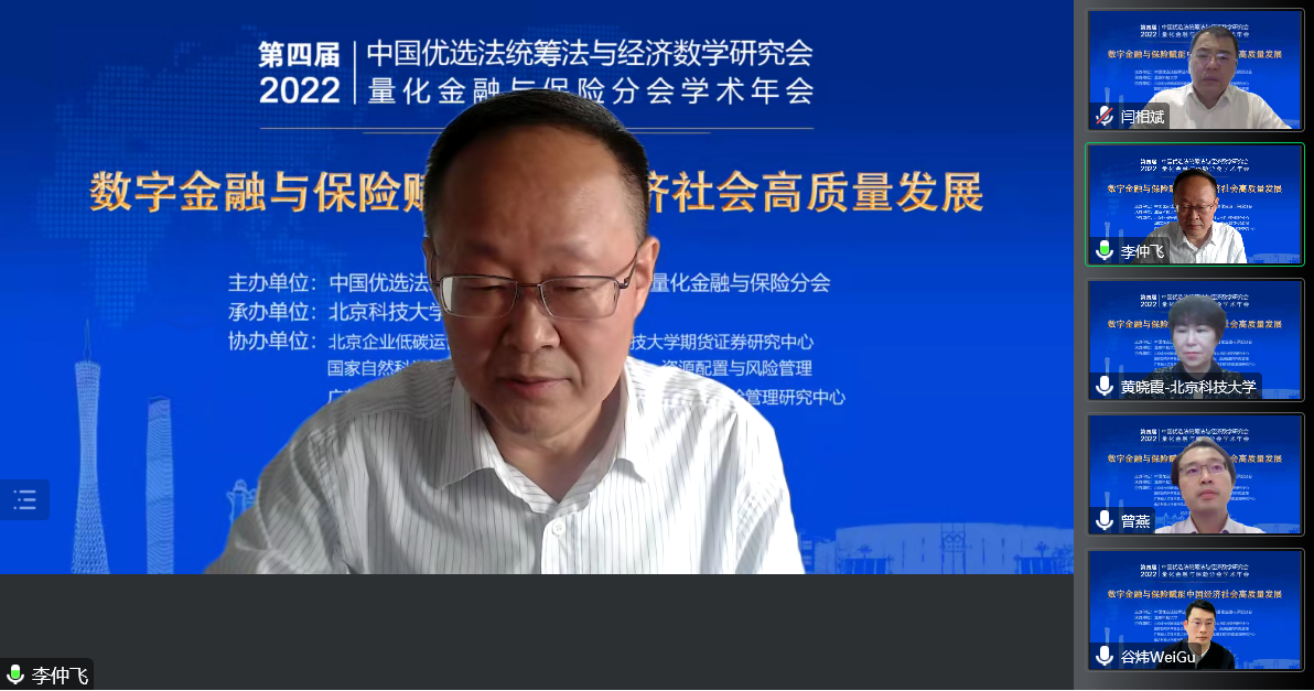 开幕式后,由国家自然科学基金委管理科学部副主任刘作仪、哥伦比亚大学的周迅宇教授、中国科学院的汪寿阳院士和中国科学院系统科学研究所副所长杨晓光研究员作大会报告。首先,刘作仪主任作了题为《2022年度基金项目资助及改革情况》的大会报告,详细介绍了2022年度管理学部基金资助情况和改革情况。然后,周迅宇教授作了题为《ReinforcementLearninginContinuousTimewithFinancialApplications》的大会报告,介绍了无模型连续时间强化学习及其在金融资产管理中的应用。上半场大会报告由大会主席李仲飞理事长主持。汪寿阳教授作了题为《加密货币的几个问题》的大会报告,从比特币挖矿谈起,通过几个案例来分析数字经济时代风险管理的一些新问题,并针对这些新问题,提出新理论、新方法与新技术,促进数字经济风险管理理论的研究与发展。最后,杨晓光研究员作了题为《数字经济的内在逻辑》的大会报告,报告指出了从卖方经济到买方经济的人类行为的变化,使得互联网和信息技术全面赋能经济各个环节,并阐述了数字经济的经济产出中市场和数据要素的重要性。下半场大会报告由狂人小说 副院长黄晓霞教授主持。大会报告内容丰富、精彩纷呈,为参会人员呈现了一场量化金融与保险前沿研究的思想盛宴。大会报告期间通过腾讯会议参与大会报告学习讨论的人数达到了300上限,同时还有近500人通过线上直播的方式参与大会报告的学习。