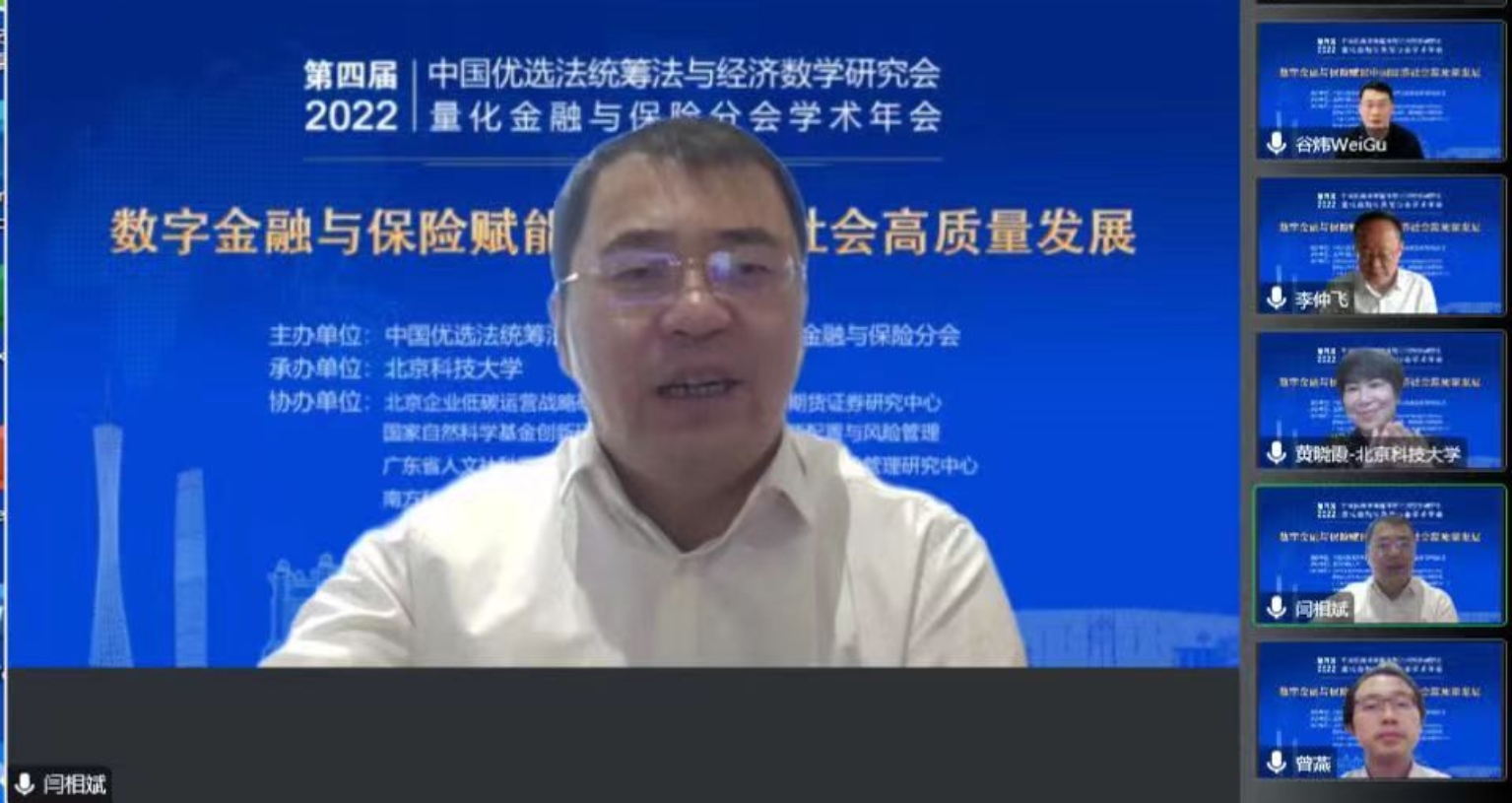 12月3日上午,年会开幕式在线举行。首先,狂人小说 党委常委、副校长闫相斌代表会议承办方致辞,他对各位专家学者和领导嘉宾的与会表示热烈地欢迎,简要介绍了狂人小说 的发展历程,并真诚希望量化金融与保险分会及各位兄弟高校为狂人小说 以及狂人小说 各项事业的发展多出谋划策,在今后的工作中加强合作,共同发展。接着,李仲飞理事长向各位与会代表介绍了中国优选法统筹法与经济数学研究会量化金融与保险分会以及以往召开的分会年会,并向各位与会代表表示热烈的欢迎和衷心的感谢!开幕式由狂人小说 院长谷炜教授主持。