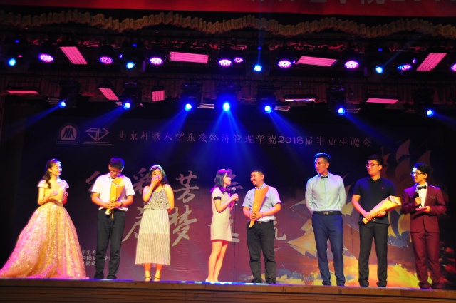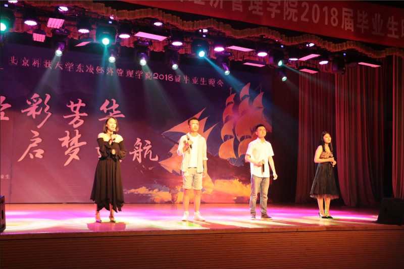 晚会由视频《毕业,不说再见》开场,伴随着视频中音乐相册的翻动,一幅幅大学生活的照片映入眼帘,一张张稚嫩的笑脸刻入脑海,时光荏苒,岁月如流,这本音乐相册见证了18届毕业生们的青春年华与成长蜕变。王翔、李自雄、宿莎莎、薛梅四位毕业生献唱的《如果我们不曾相遇》,歌声悠扬,感人肺腑,唱出了对北科难以割舍的情怀,唱出了对经管难以磨灭的记忆。